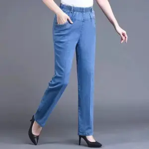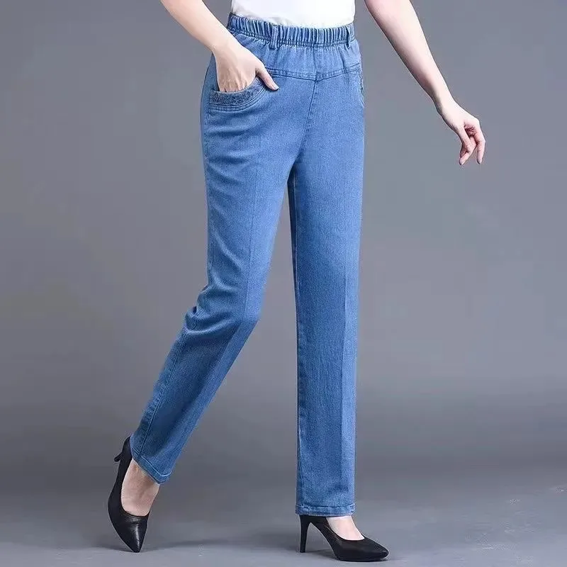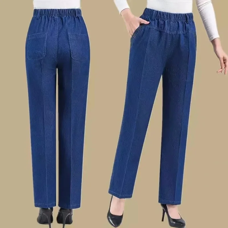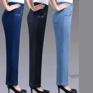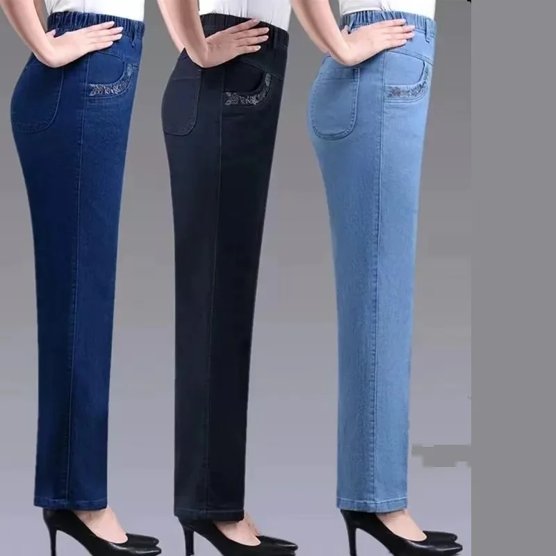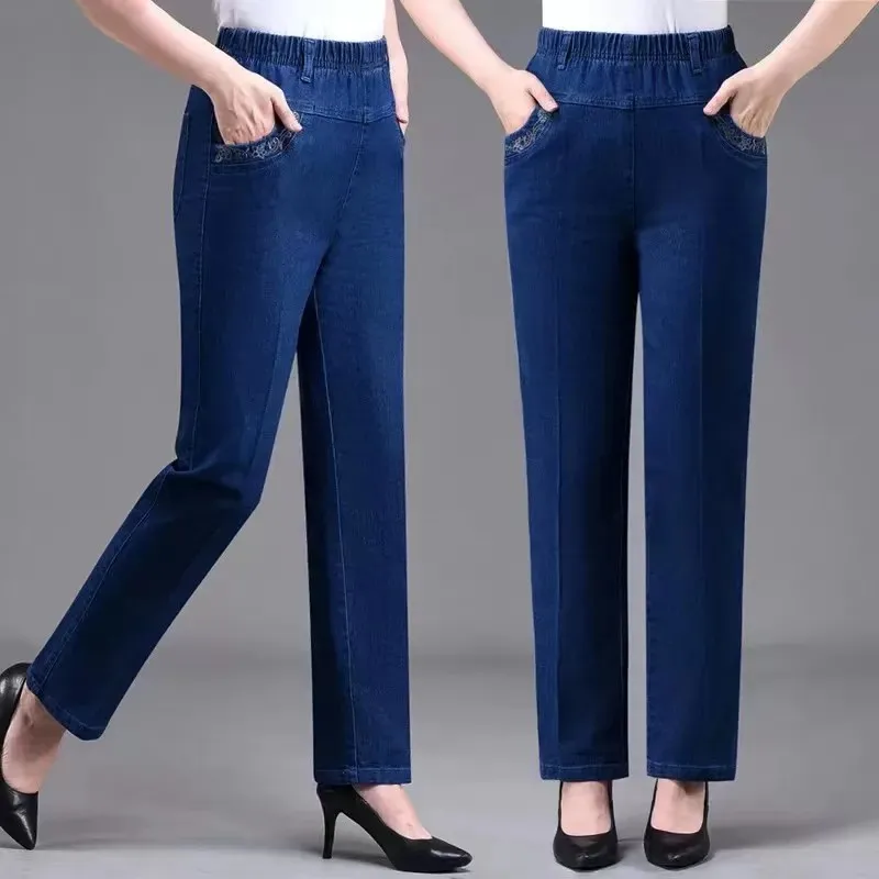 10 reviews for Middle aged elderly Women’s Jeans Embroidered Pockets Elastic waist Mom Pants Casual Denim Straight leg Trousers 2025 New Spring