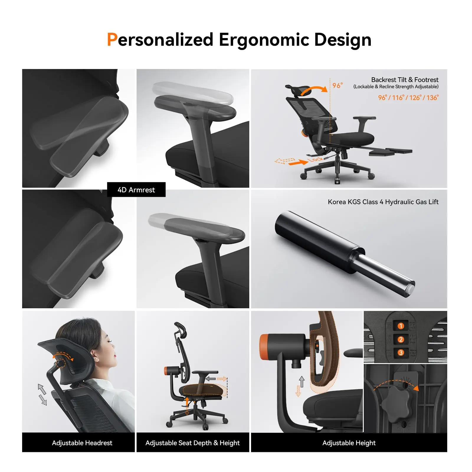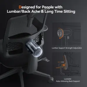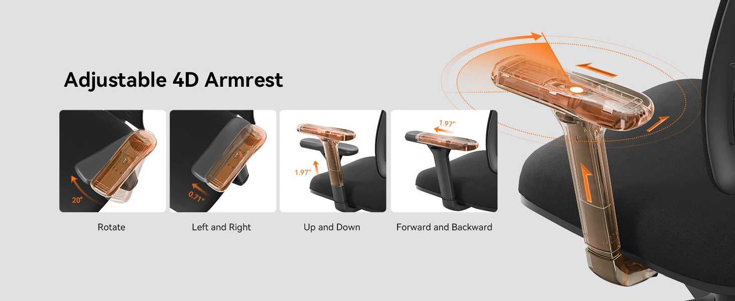 With 4D armrests, a divided-stress-zone high-density sponge cushion, and an adjustable seat for height and depth comfort for long-time sitting. Suitable for people 5’3″ to 6’3″ tall.
