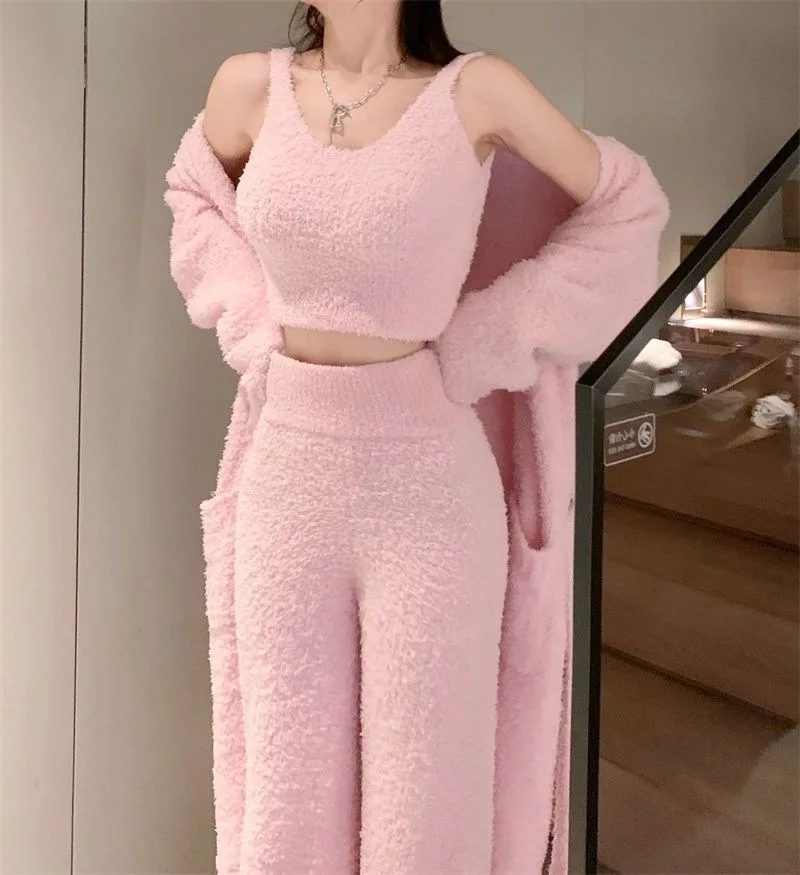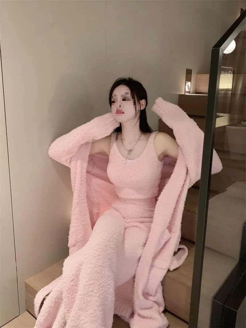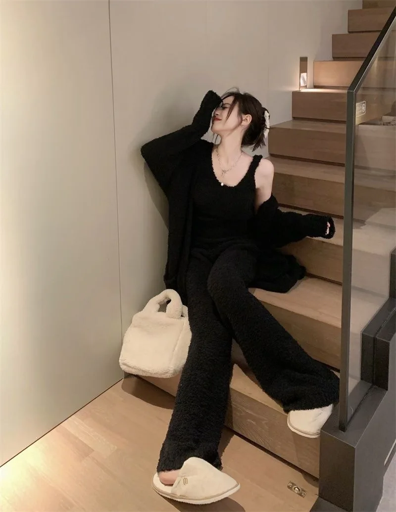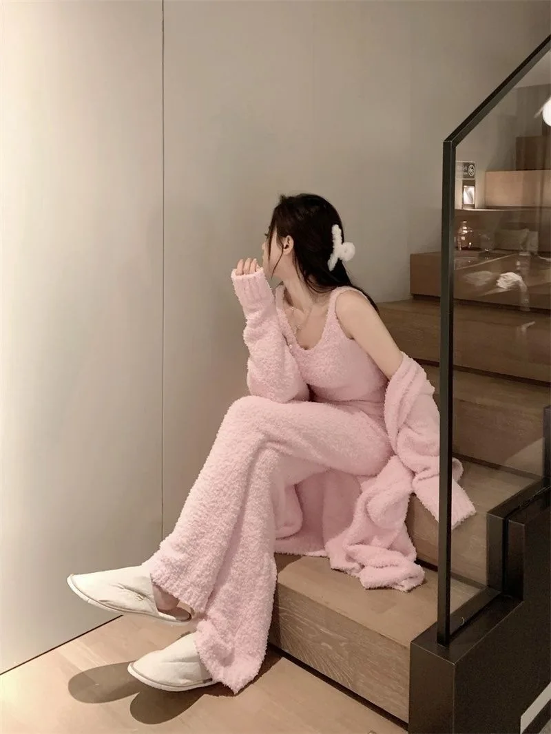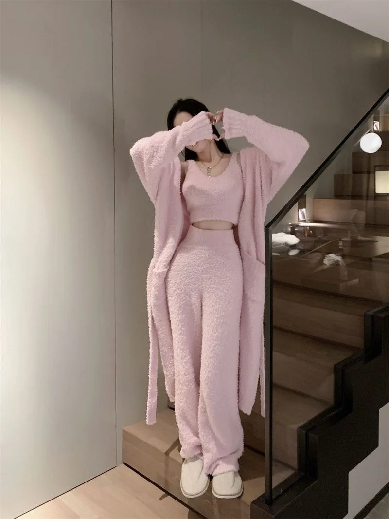 This autumn-winter sleepwear set is a chic choice for cozy comfort, featuring a plush knit cardigan, a long-sleeved top, and long pants.