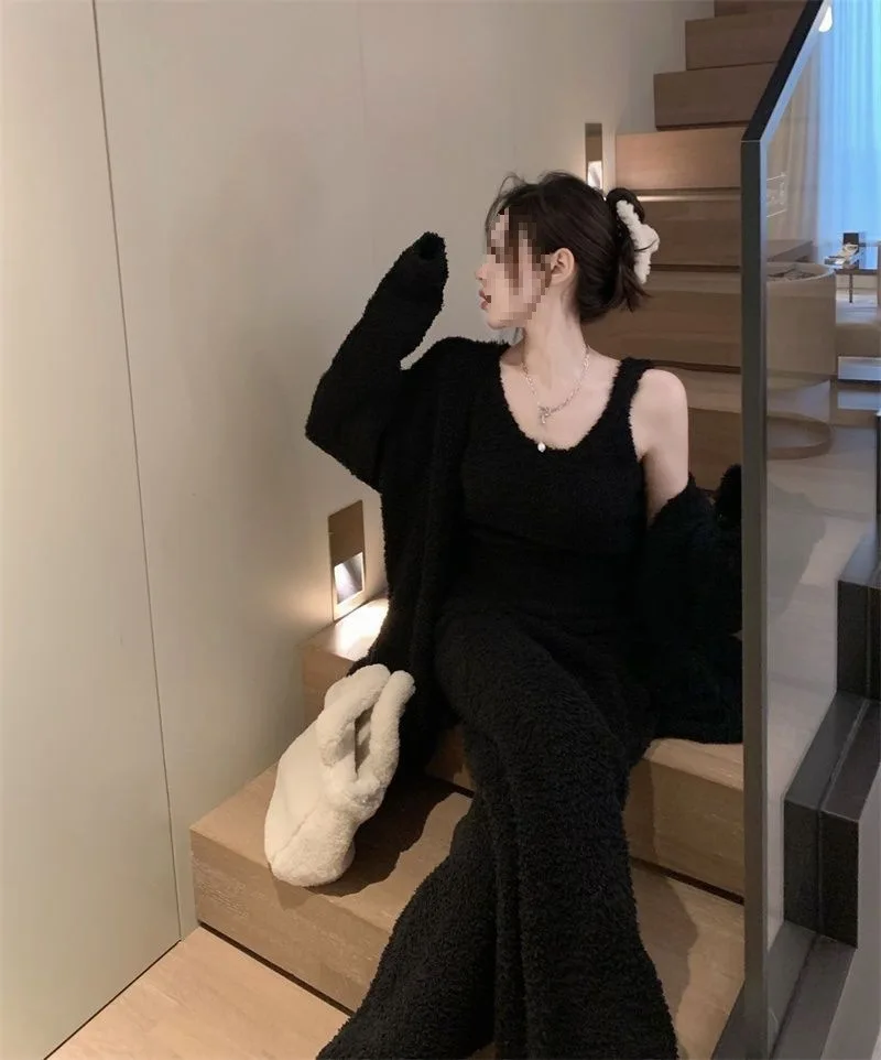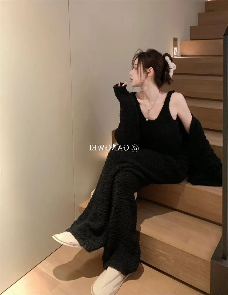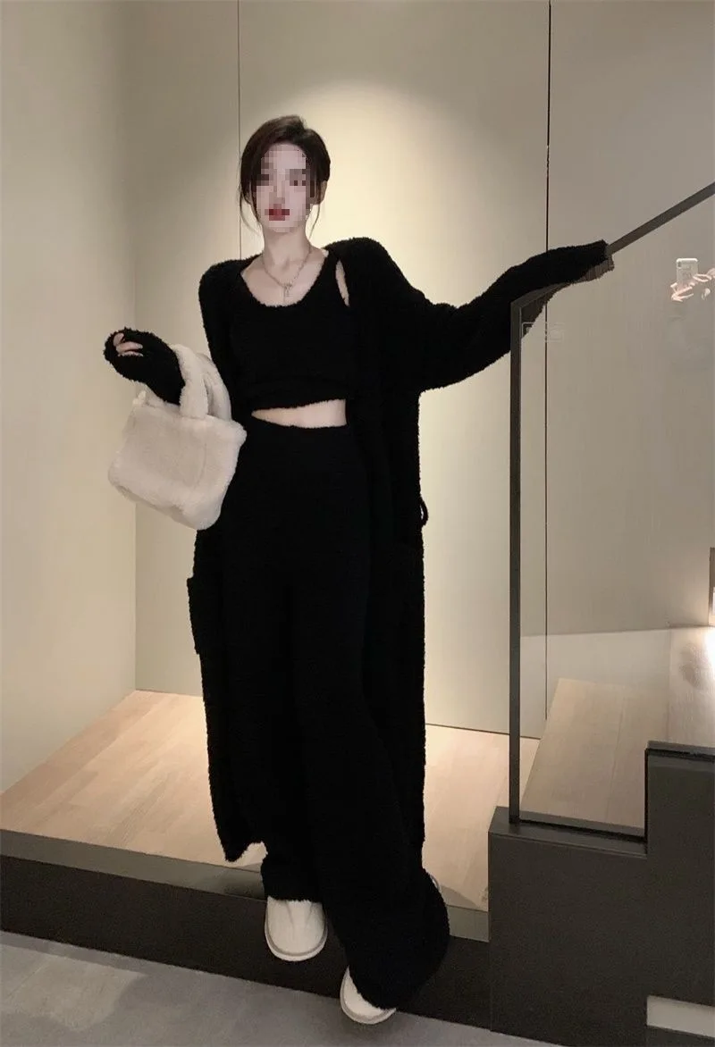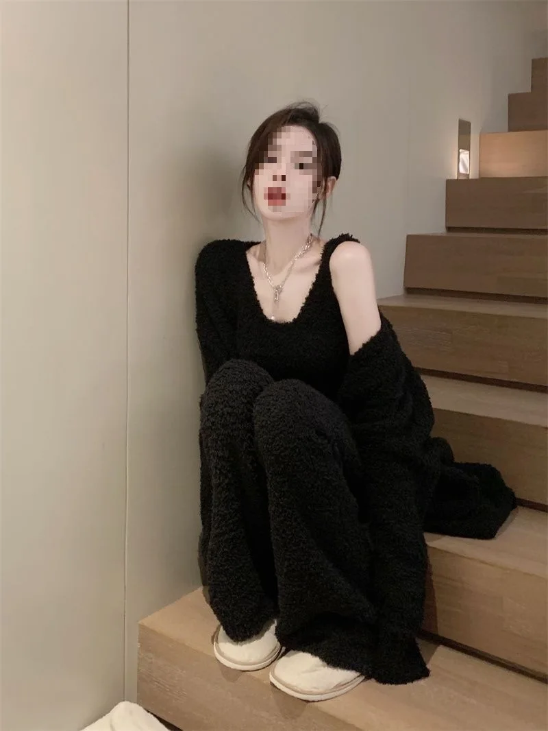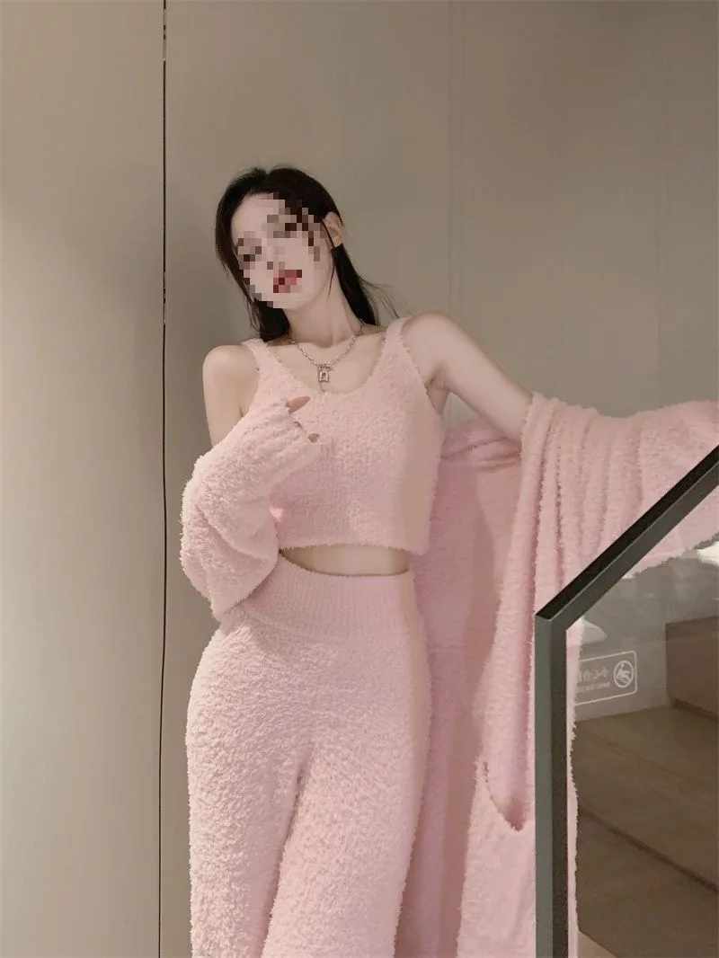 This autumn-winter sleepwear set is a chic choice for cozy comfort, featuring a plush knit cardigan, a long-sleeved top, and long pants.