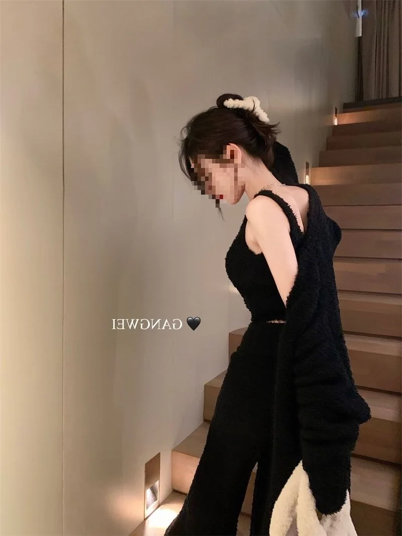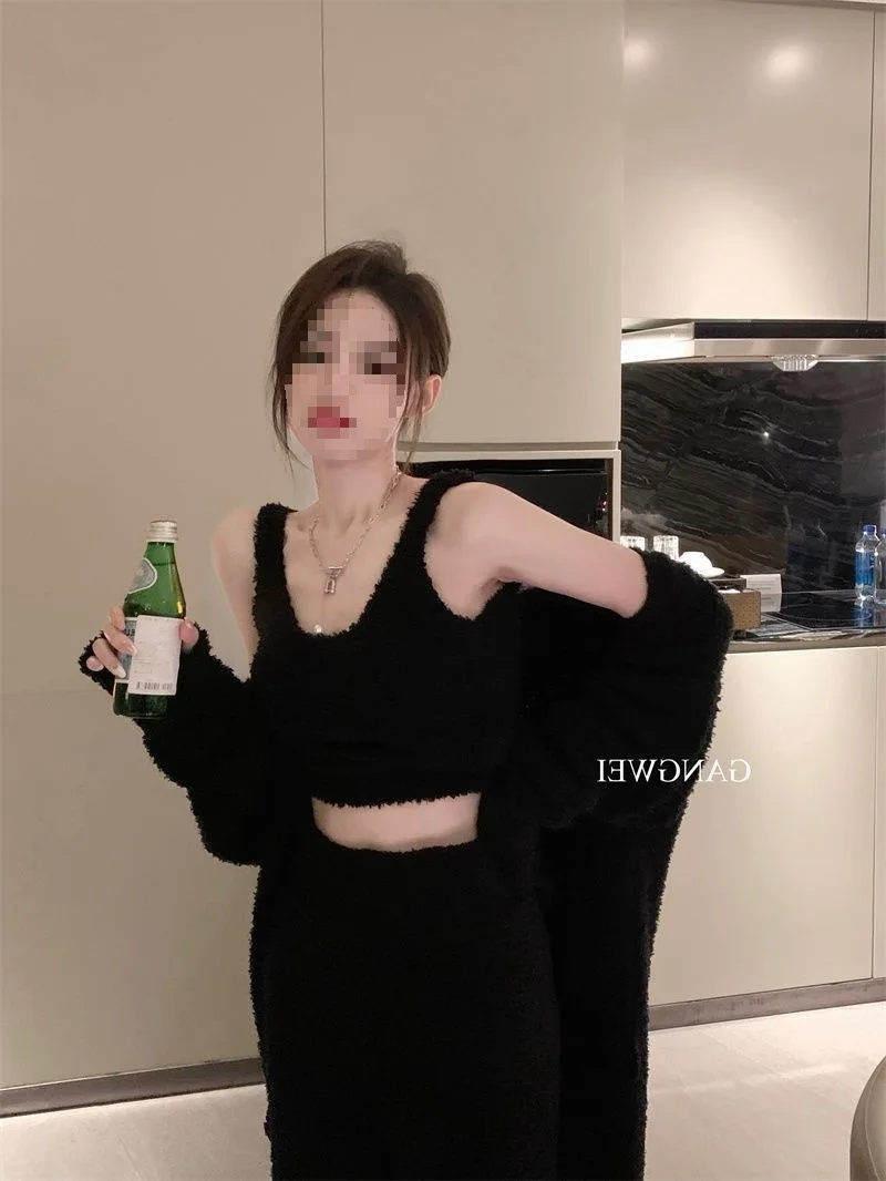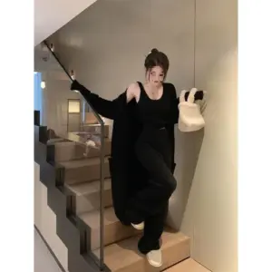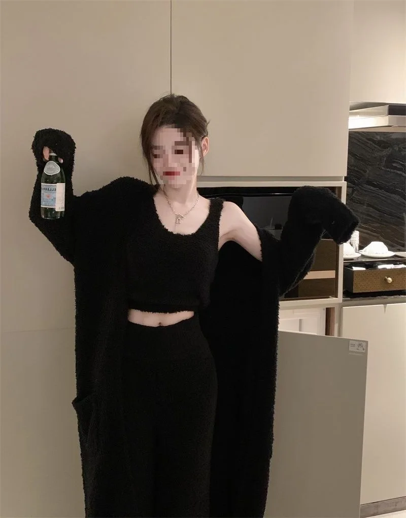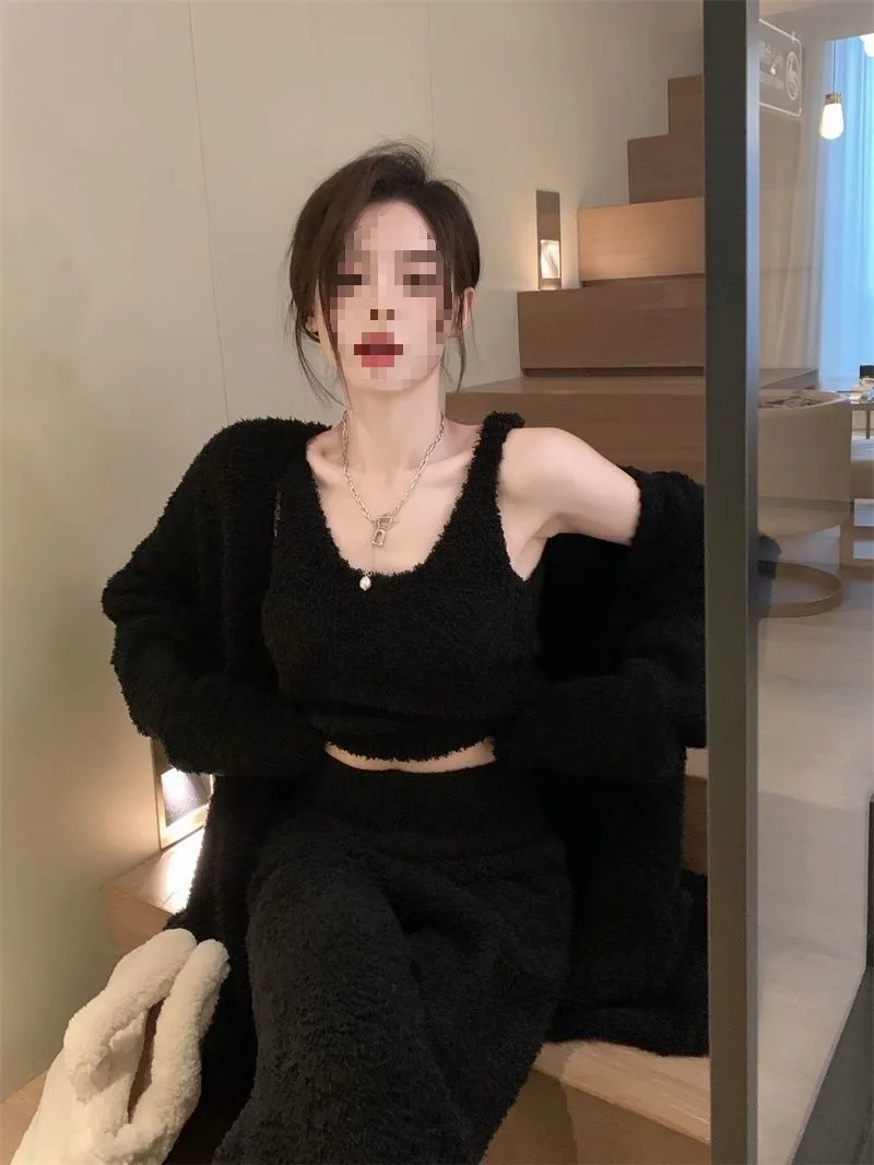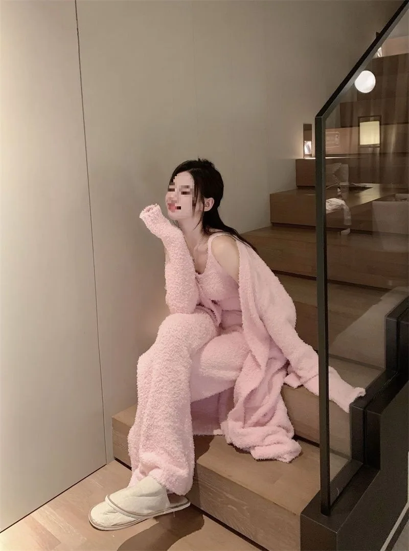 This autumn-winter sleepwear set is a chic choice for cozy comfort, featuring a plush knit cardigan, a long-sleeved top, and long pants.