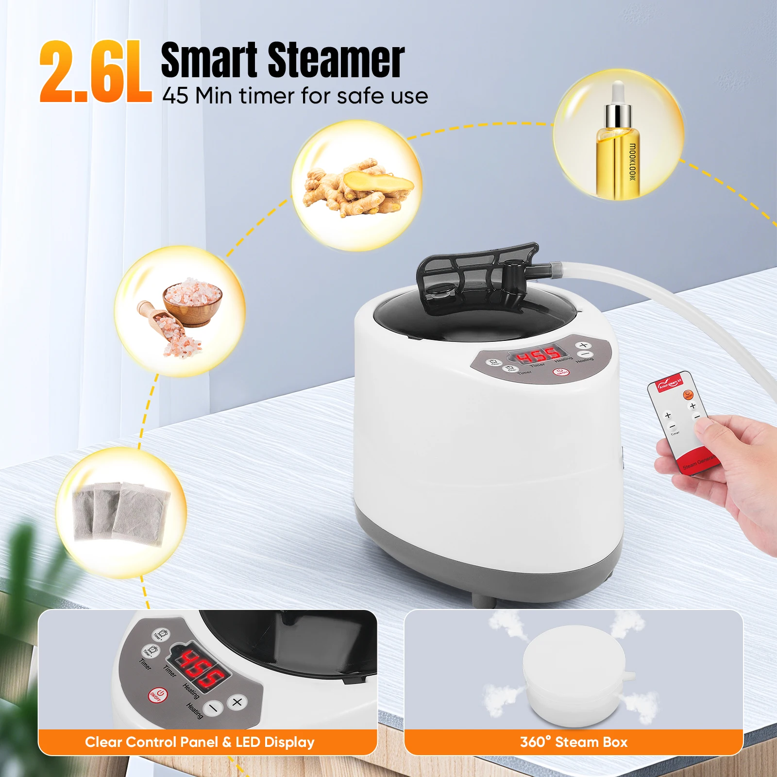 Our 2.6L smart steamer heats up in just 5 minutes, with 9 adjustable temperature settings (35°C–63°C / 95°F–145°F) for personalized comfort. The remote controller and built-in 45-minute auto shut-off timer provide both convenience and safety.