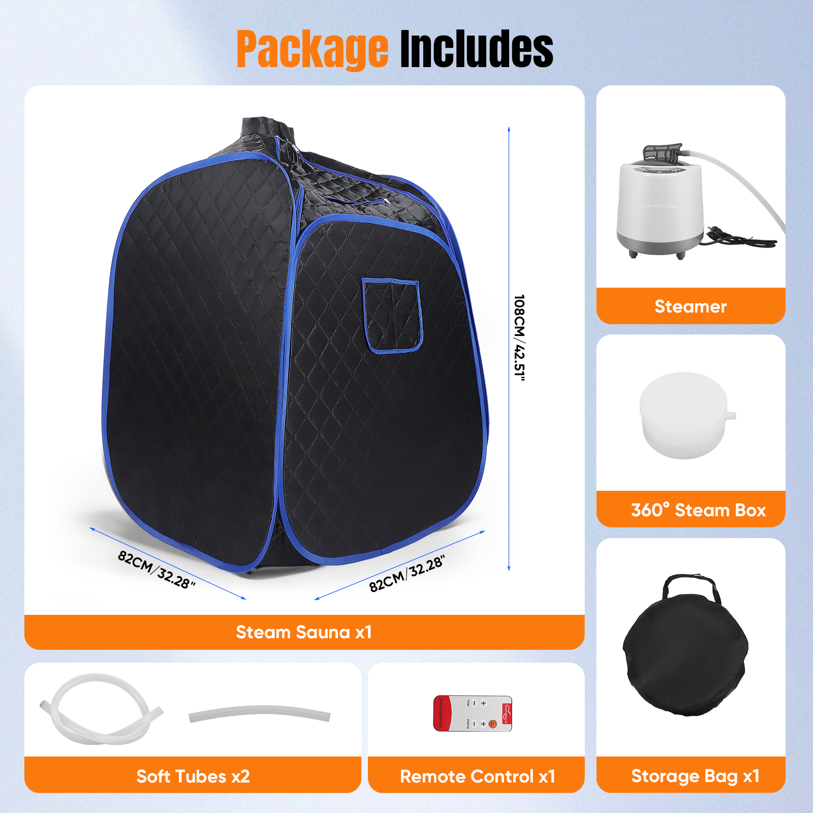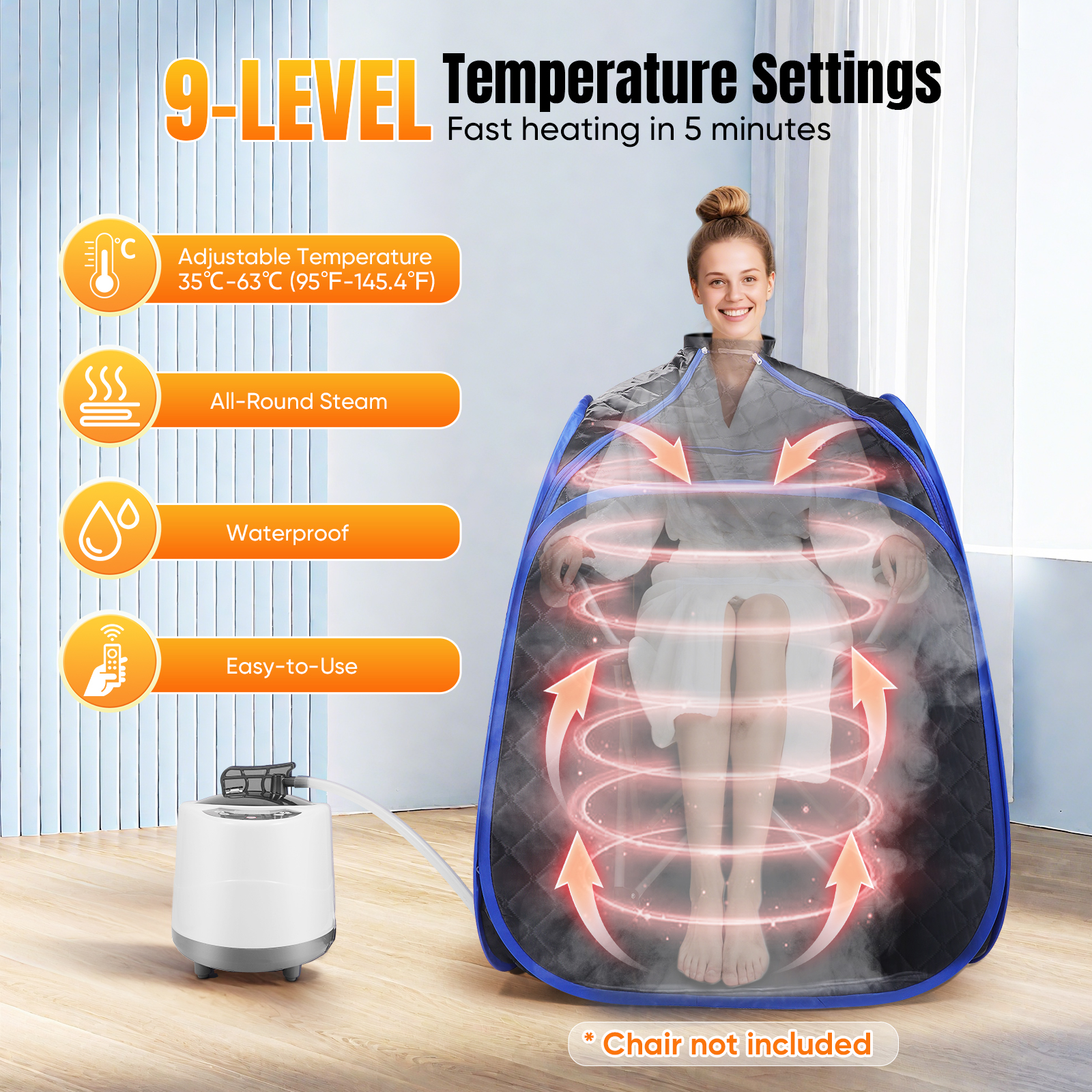 Enjoy a spa-like experience at home with this fast-heating, foldable steam sauna. It warms up in just 5 minutes with 9 adjustable temperatures (35°C–63°C / 95°F–145°F) for personalized comfort. Control settings easily with the included remote, while the 45-minute auto shut-off keeps you safe. Built with a sturdy stainless-steel frame and waterproof lining, it’s durable and easy to clean. The user-friendly design includes zippers, armholes, and 2 front pockets for books, snacks, or your phone. Its portable design (32.28″ x 32.28″ x 42.51″/ 82 x 82 x 108 cm) fits in small spaces, making it ideal for apartments, bedrooms, or home gyms. Regular use helps relieve muscle tension, improve circulation, and promote relaxation, making it perfect for post-workout recovery or stress relief.