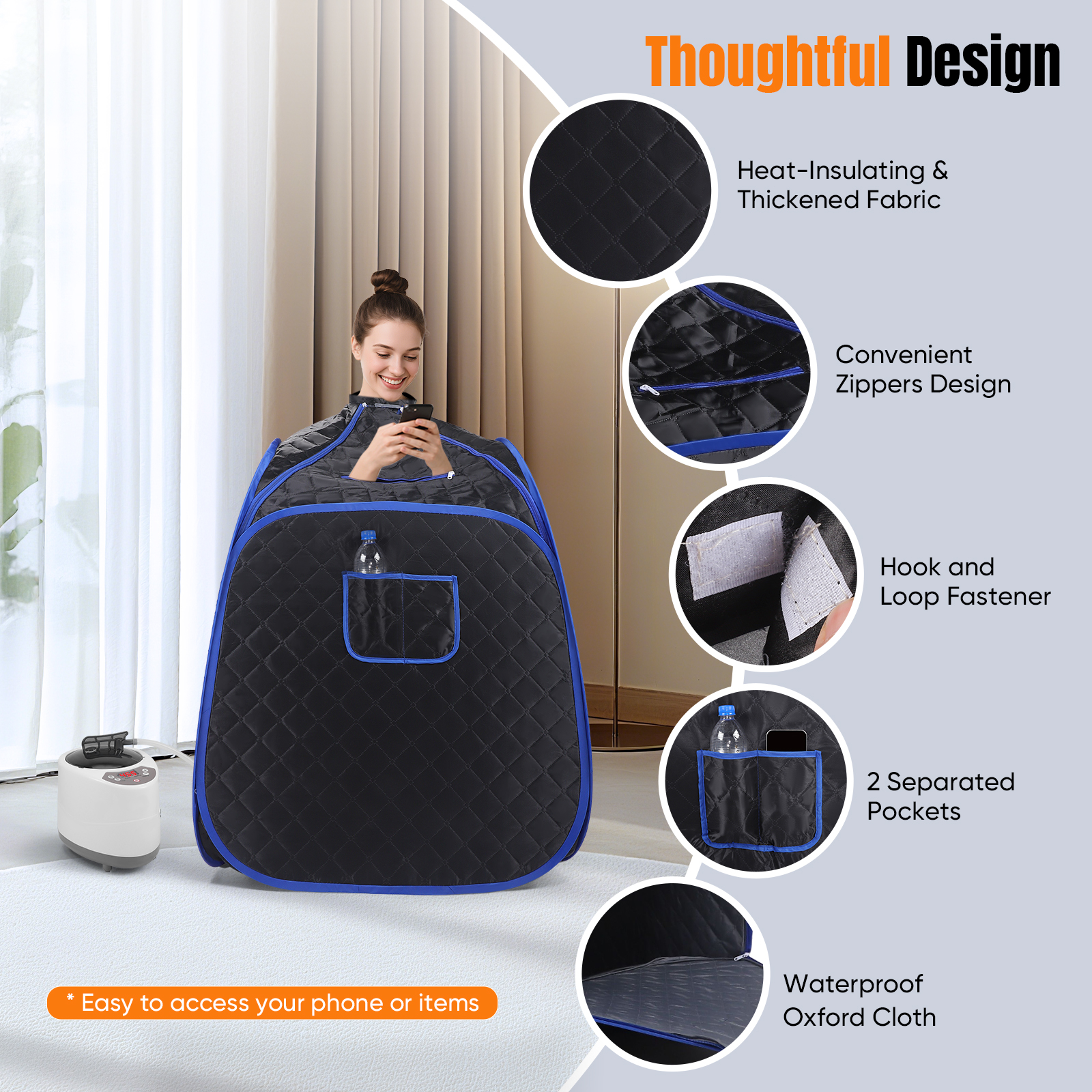 This sauna features easy-access zippers and armholes, allowing you to read, watch movies, or listen to music in comfort. Two convenient front pockets and zippered openings let you keep snacks or your phone within reach while you unwind.