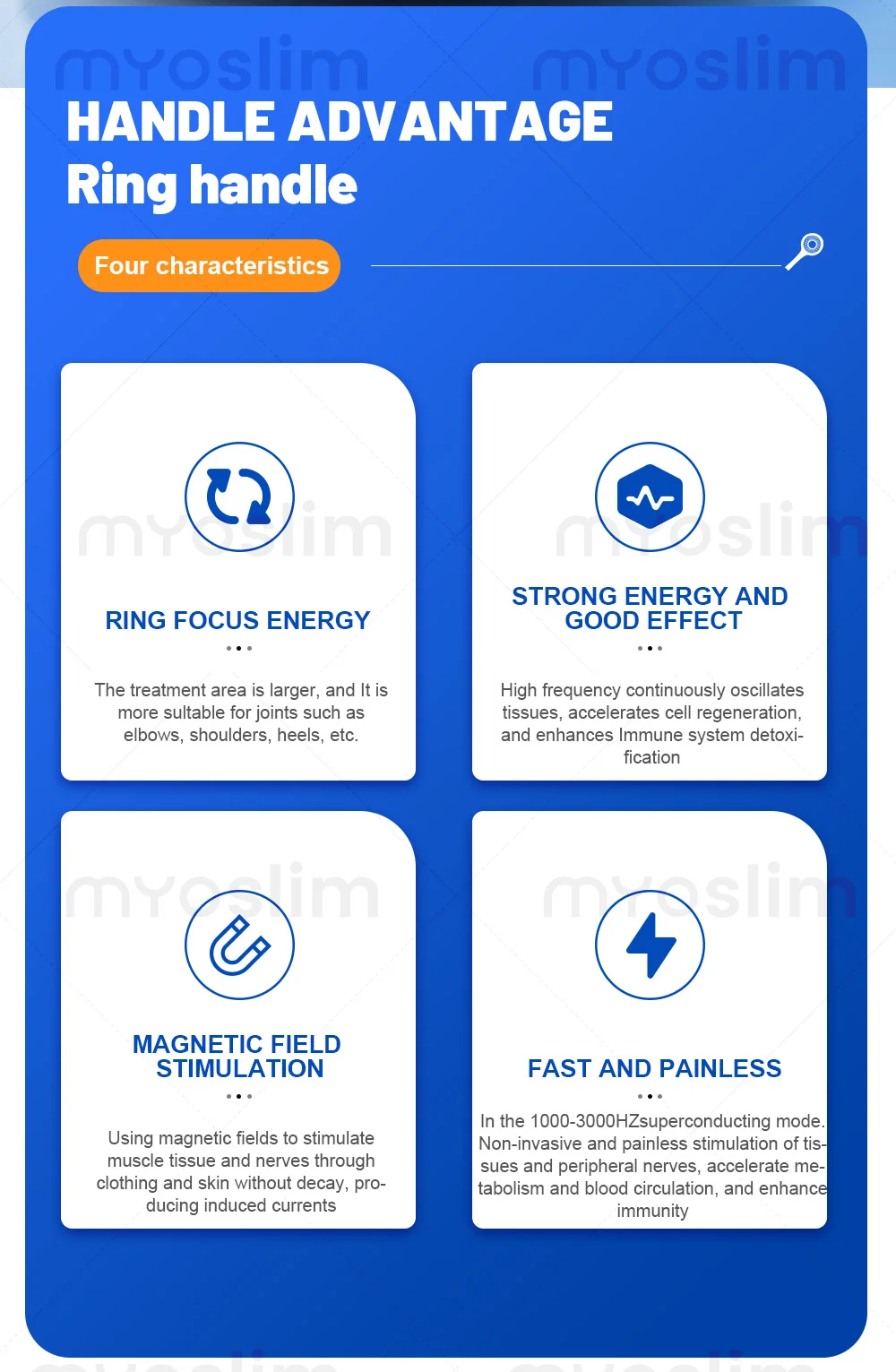 different with PEMF, it is a ring type coil, cover biggerarea and fit to joints part. High speed oscillation for deeper penetration.