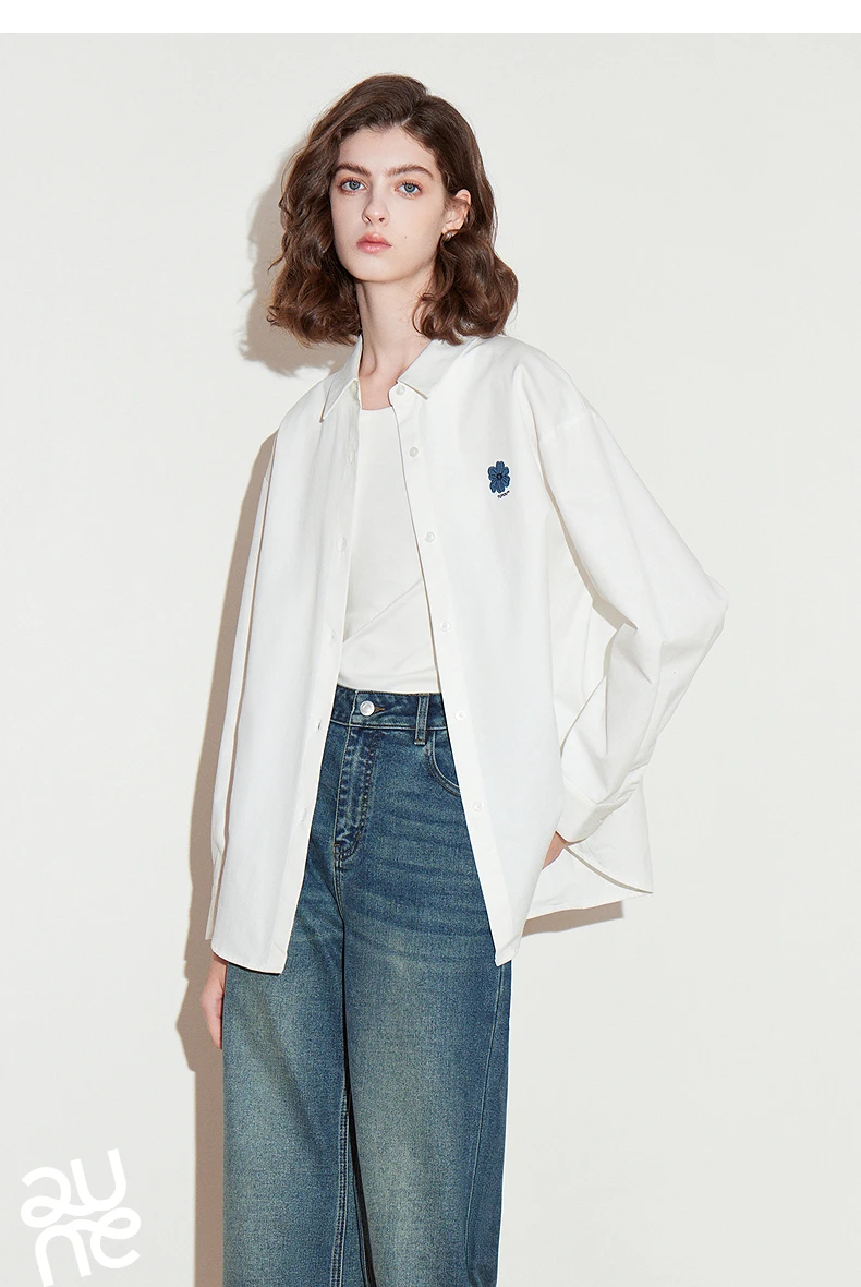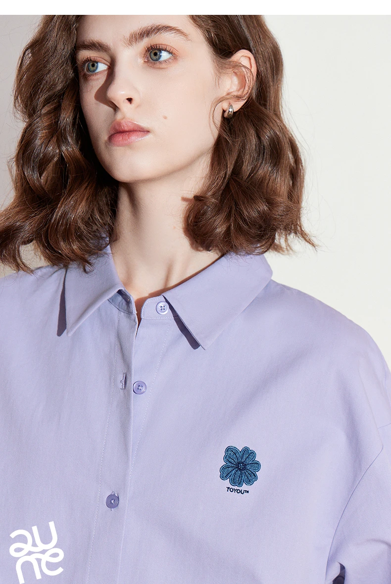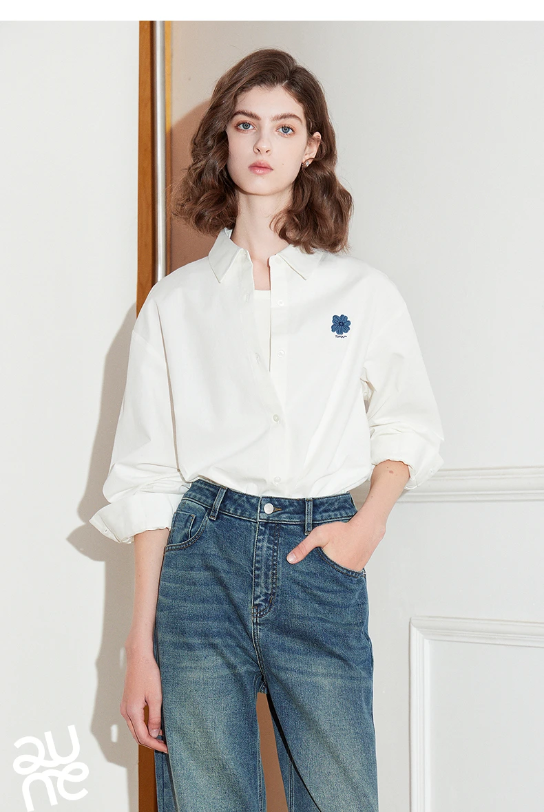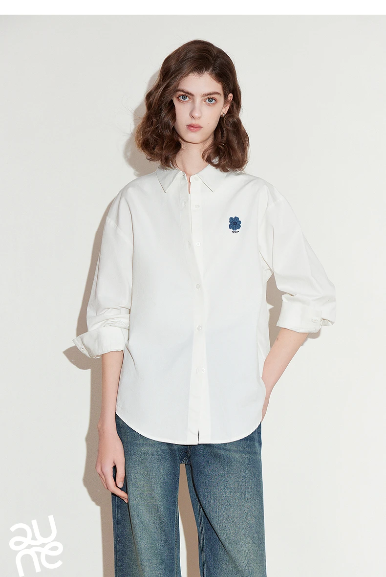 TOYOUTH Women Blouse Shirt 2025 Spring New Flower Embroidered Turn Down Collar Pure Cotton White Casual Shirt