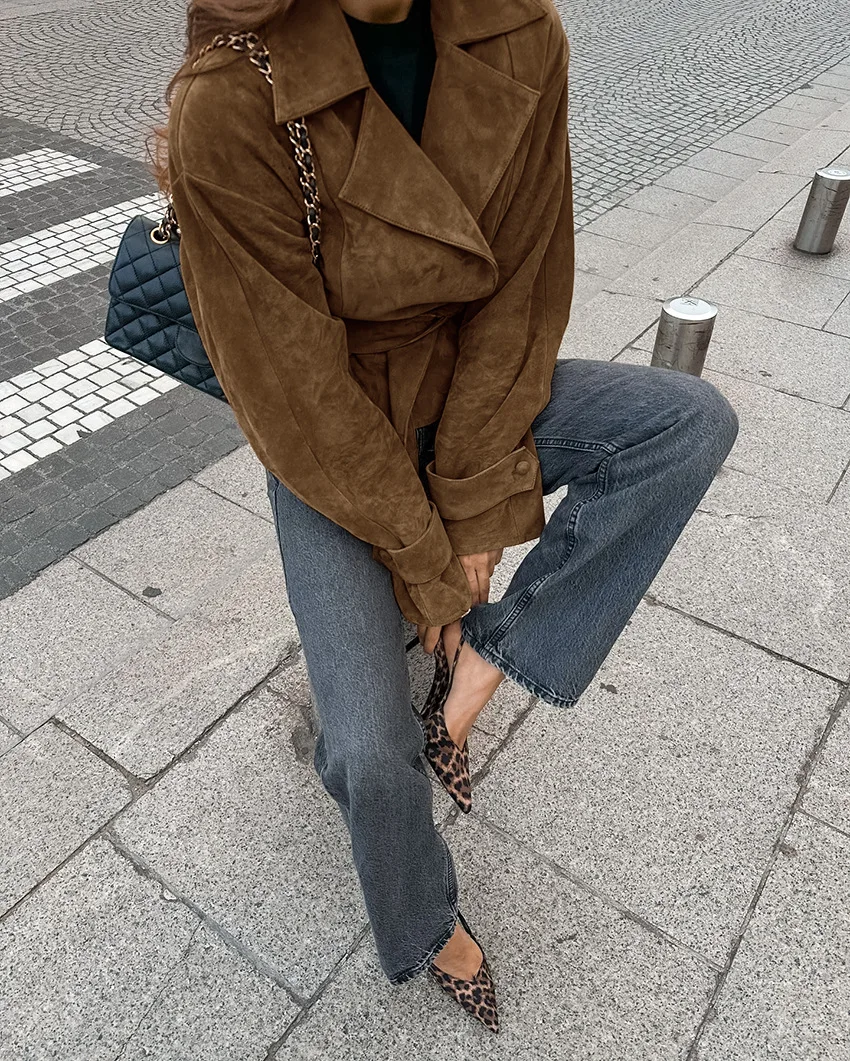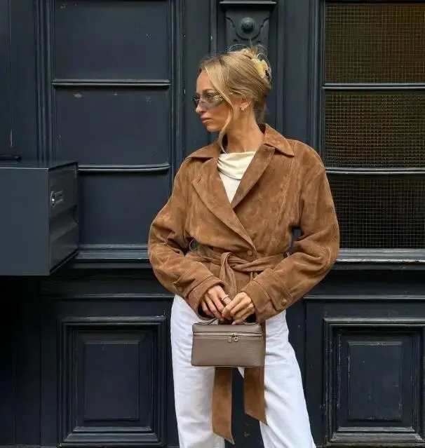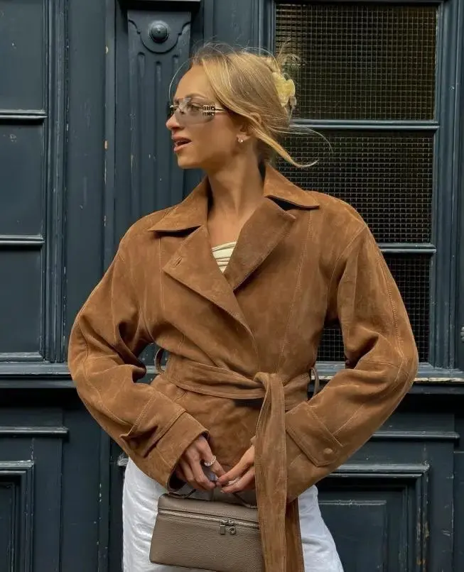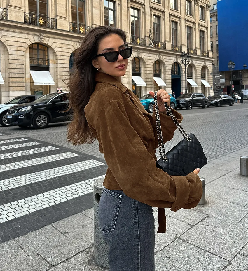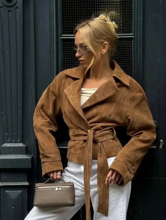 6 reviews for Vintage Suede Bomber Jacket With Belt Women Casual Brown Double Breasted Jackets Lapel Coat Basic Outwears Autumn Winter Fashion