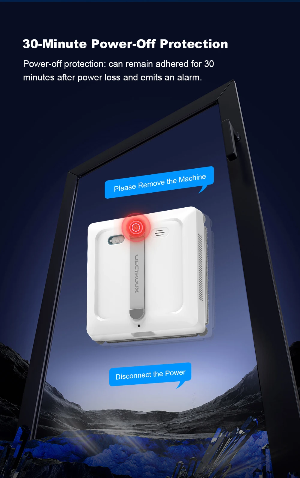 7. Built-in battery as the backup power, the robot can adhere to the glass about 30mins even if the electric is suddenly cut off;