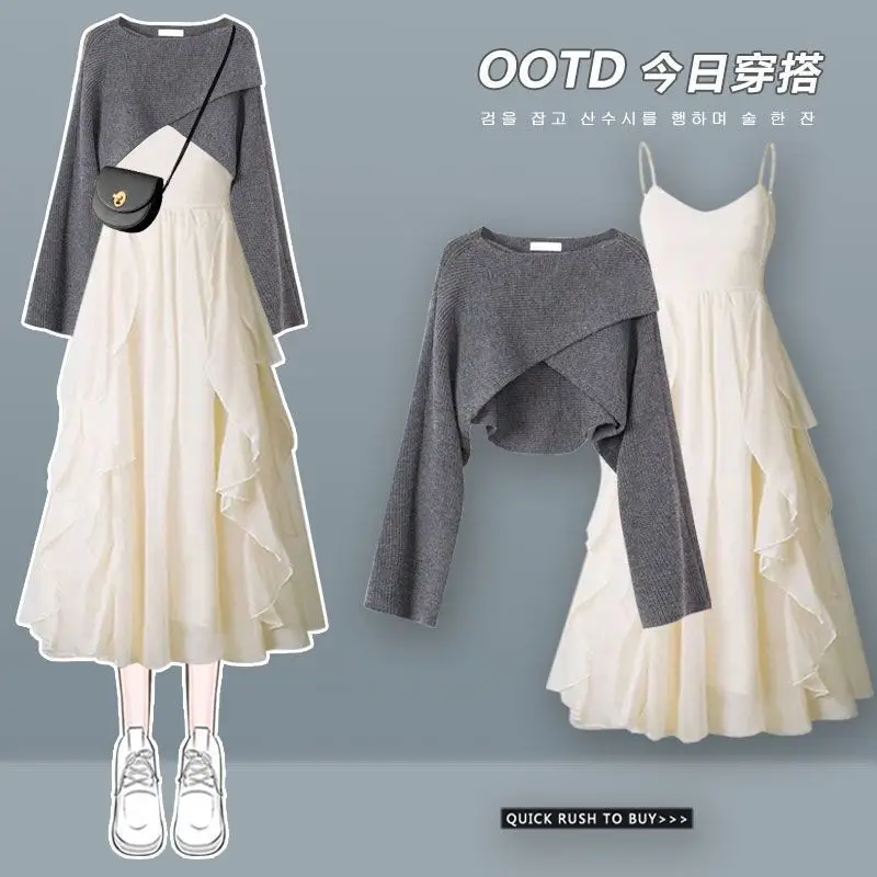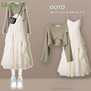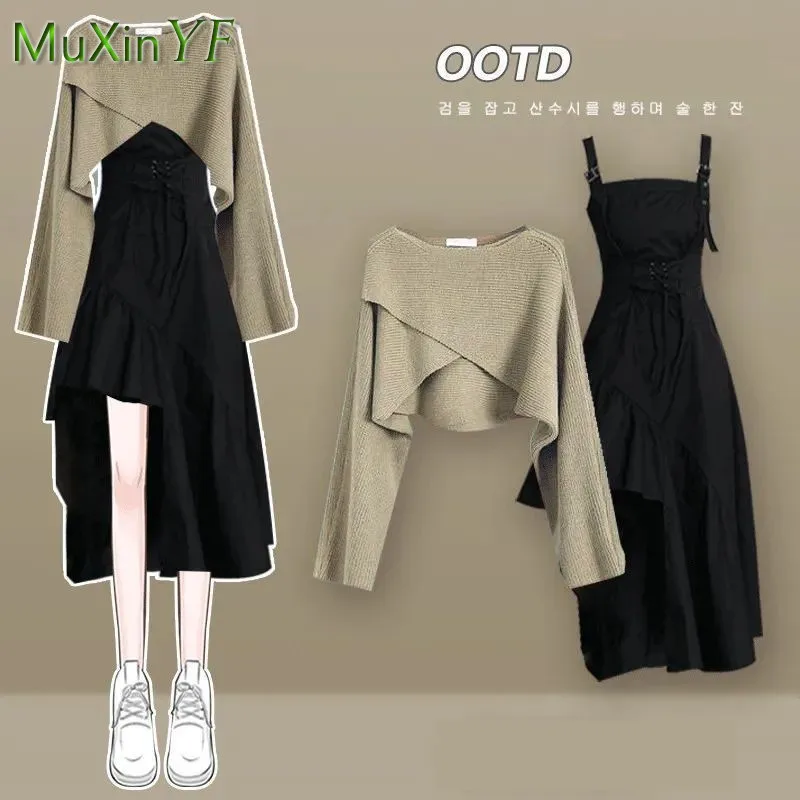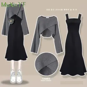 1 review for Women’s Fashion Dress Matching Set 2025 Spring Autumn New Chic Knitted Sweater Sling Skirt Two Piece Korean Elegant Clothes Suit
