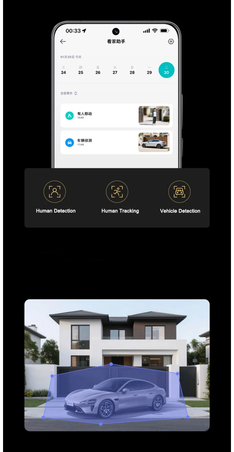 Both lenses can accurately recognize human figures and vehicles. When an abnormal state is detected, the Mijia APP will push alarm information and record videos as evidence, making protection more composed.