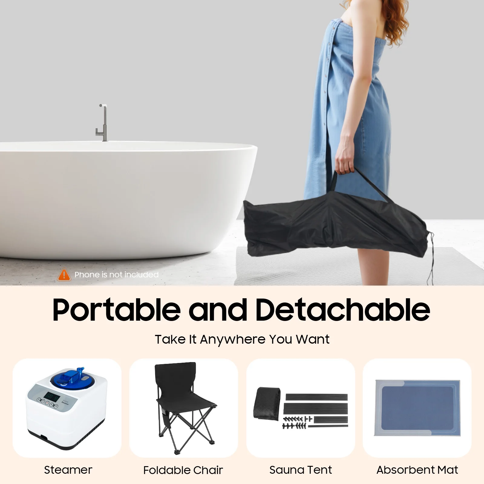 Humanized Design: The foldable chair is equipped with a storage bag (for mobile phones, remote controls, etc.), allowing you to sit comfortably inside. In addition, the absorbent anti-slip mat can be placed at the entrance of the sauna tent to reduce water stains.