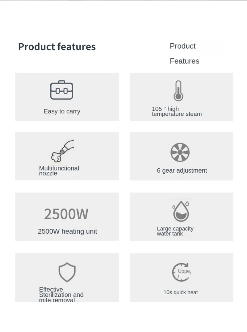 3. Lengthen power cord and steam hose, one-person operation is not laborious, can meet cleaning needs.
