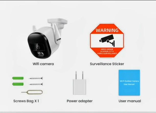IP WiFi Camera X 1,Mounting Base X 1, Mounting Screws Bag X 1, Power Adapter X 1, User Manual X 1, Surveillance Sticker X1.