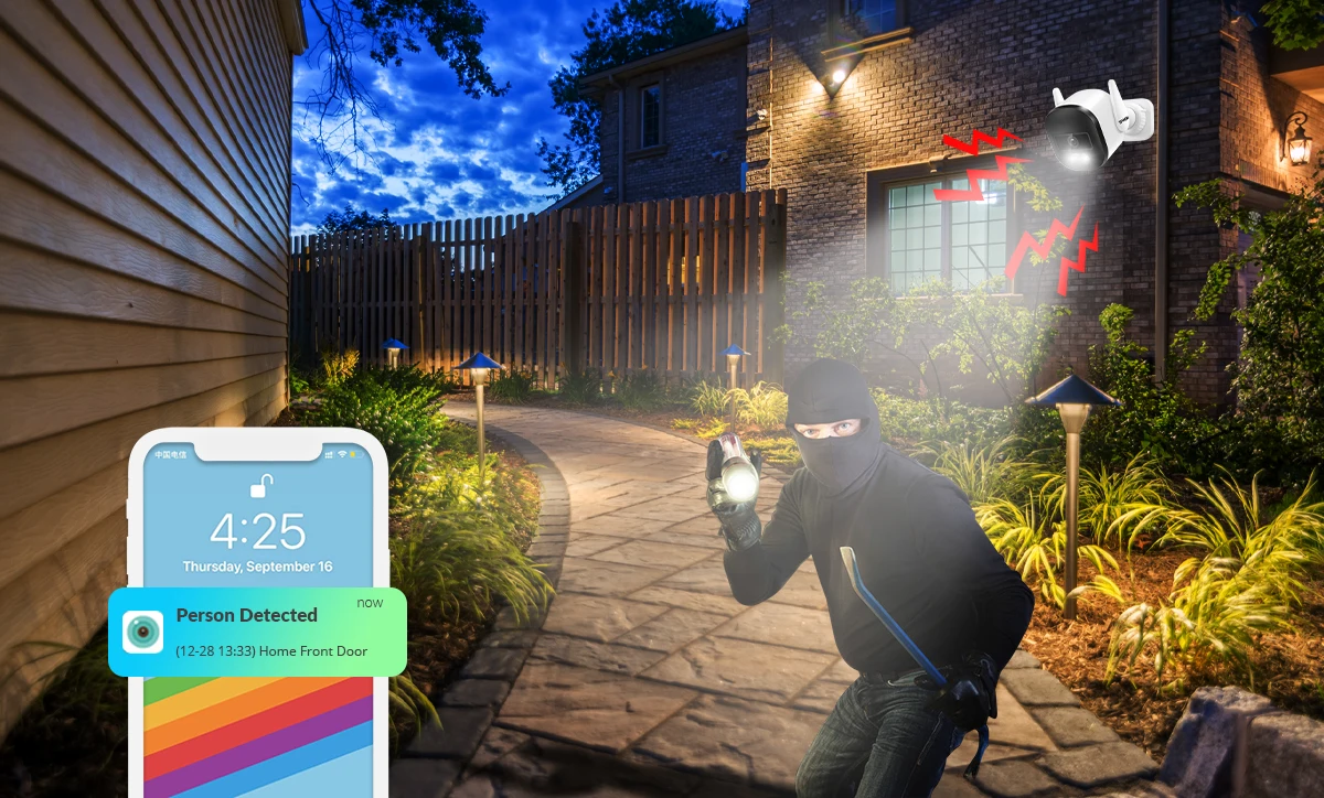 3) You can use “Double Light Alert” mode: when the light is insufficient, the infrared light activates and the camera image is black and white. When the camera detects someone at night, the camera will turn off the infrared light and turn on the white light, meaning the night vision will switch to a color picture. At the same time, the camera will send an alarm message to the mobile app.