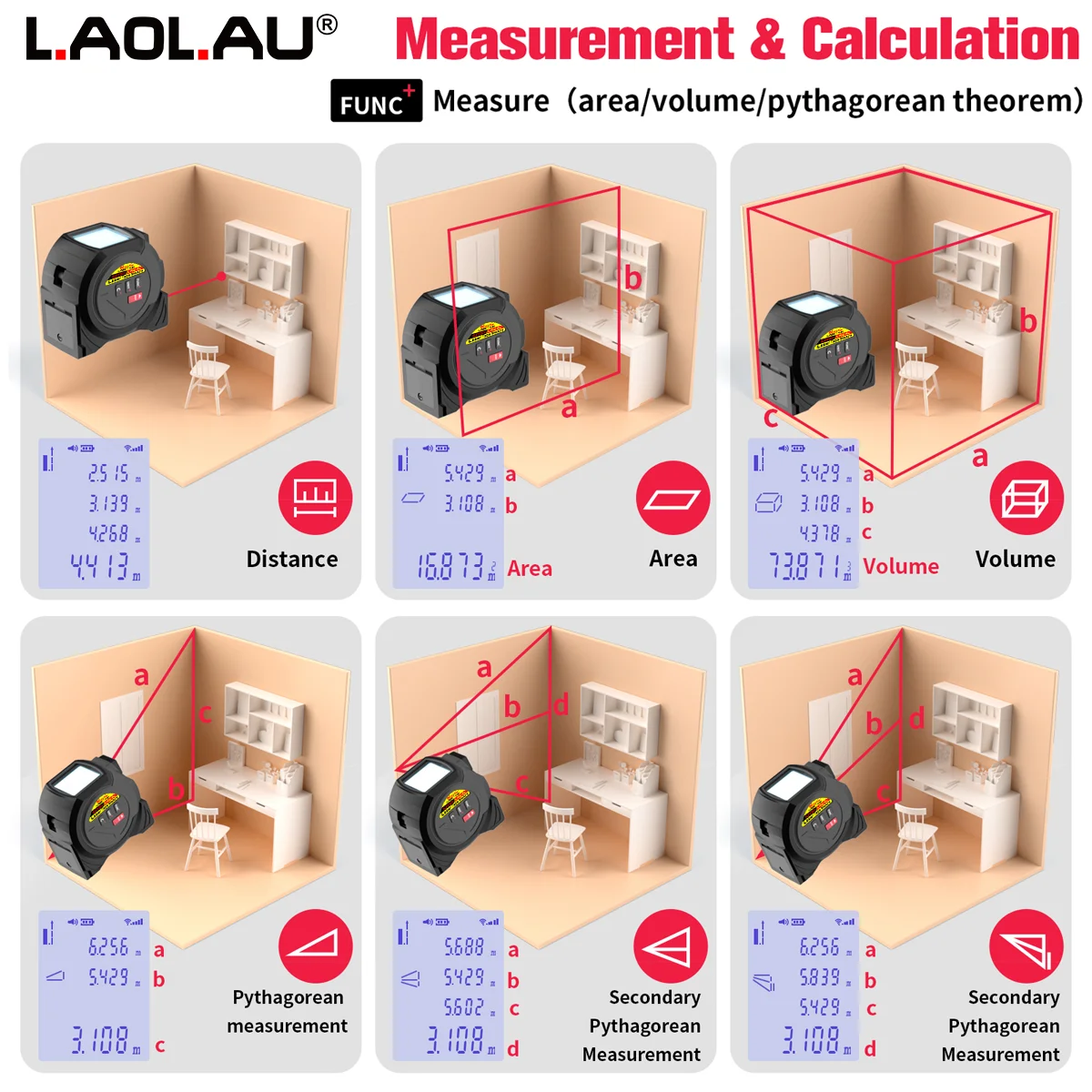 It has a variety of measurement functions, including single/continuous measurement, linear measurement, length, width and height measurement, area measurement, ticking theorem measurement volume measurement, etc.