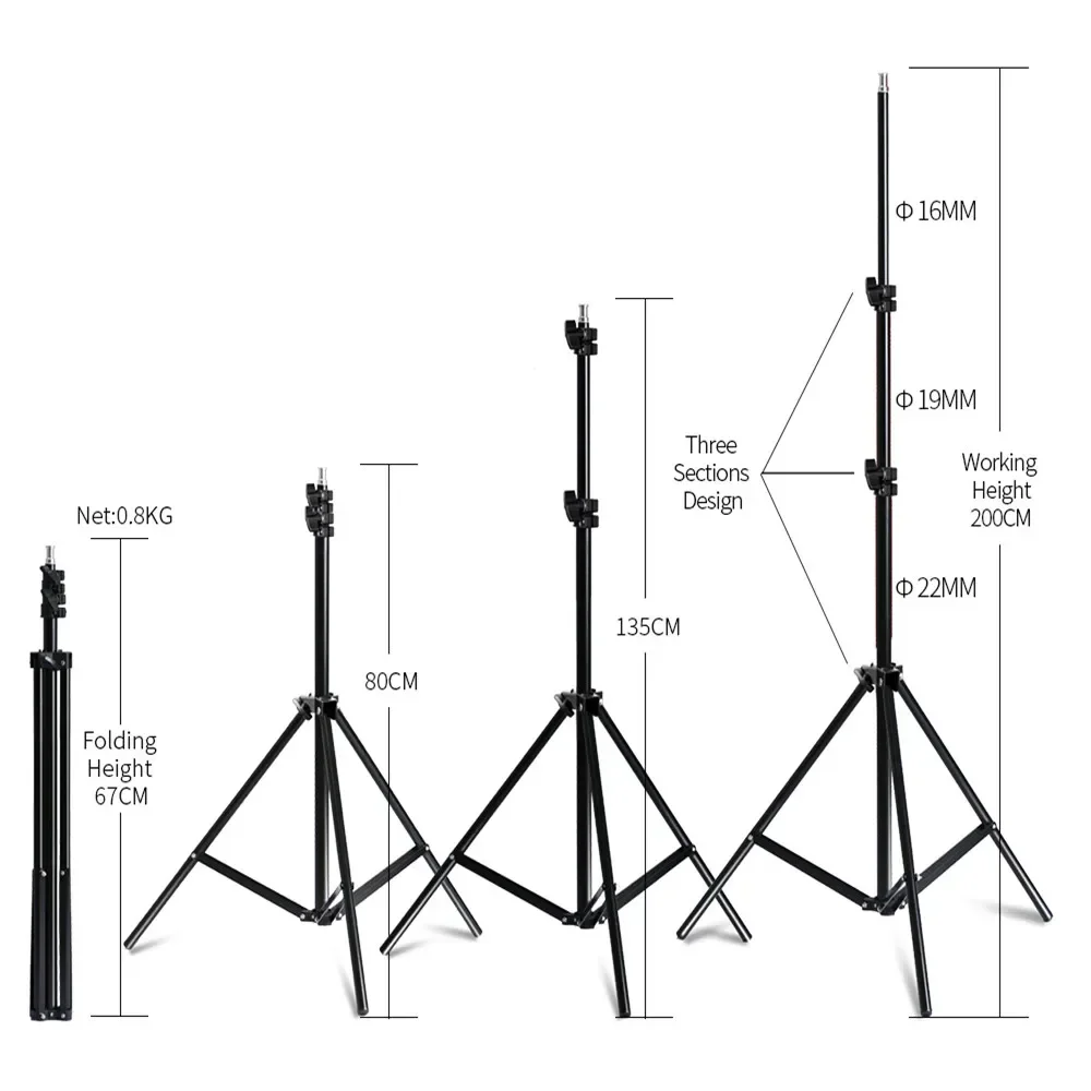 Light stand:Folded height 27inch(68cm), working height 79inch(200cm) High quality,stable and durable,easy to install and use