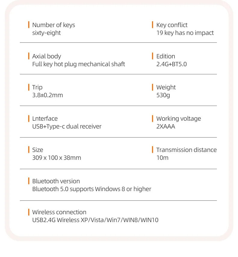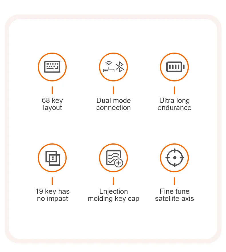 This K68 mini 60% gaming keyboard adopts an ultra-compact layout of 68 keys, with independent arrow keys, more suitable for gamers and typists, giving more space to your desktop. The Bluetooth gaming keyboard without a number keypad has a high-press ergonomic design, which is not easy to fatigue after long-term use.