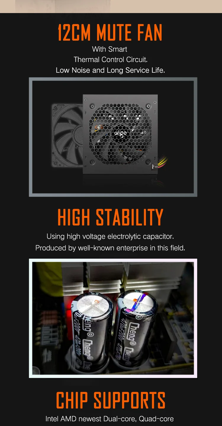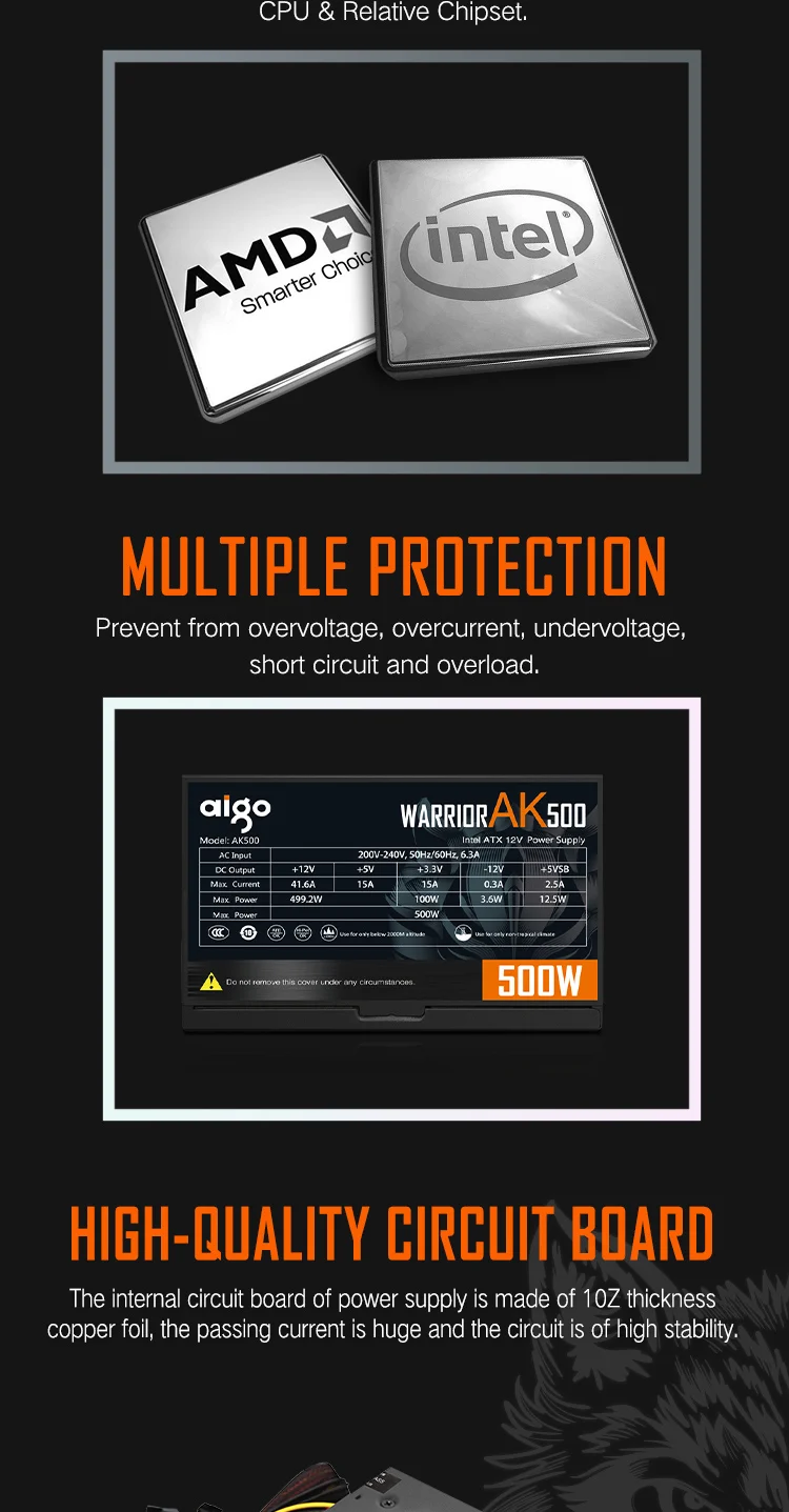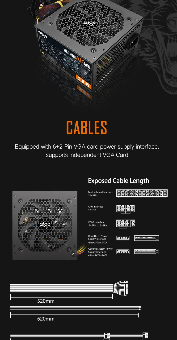 The Aigo AK 500W PC PSU delivers high power output, ensuring your computer runs smoothly and efficiently.