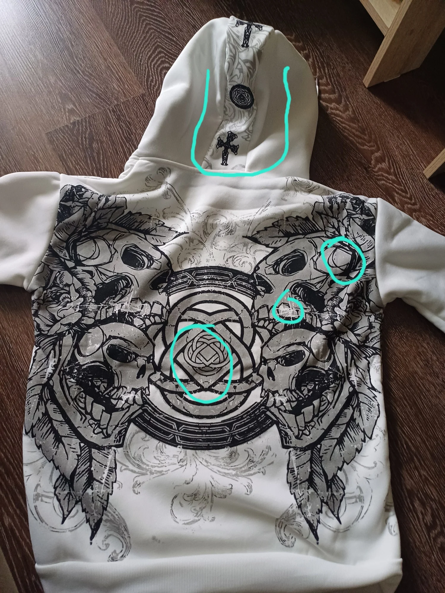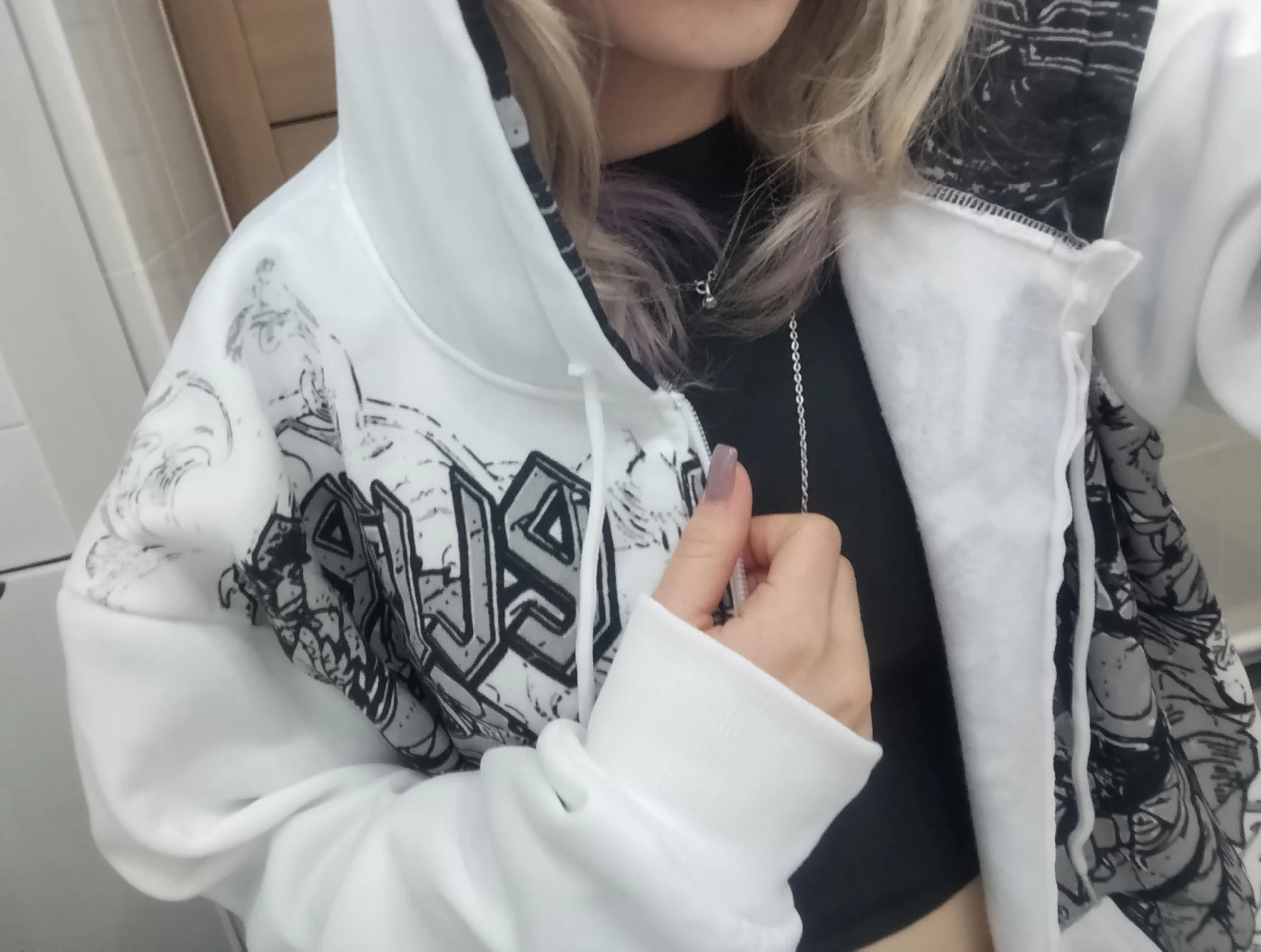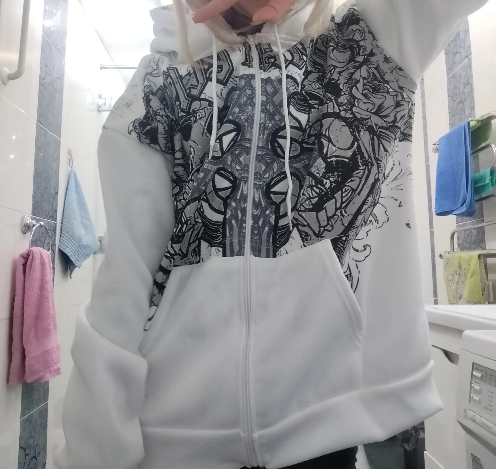 For height 170, weight 49, took size M. Fits well, not too big. The print is quite high quality, but there are a few differences: the color of the design, the placement of the "scratches", the pocket is raised or the design is shortened, the stripe with the design on the hoodie is thinner, the laces are different, and the sign on the back is different.