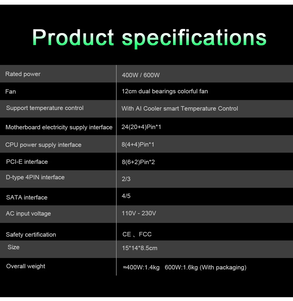 ATX 400W 600W 110-230V RGB 12V PC PSU 150*140*85MM Professional E-Sports Video Game Computer Power Supply