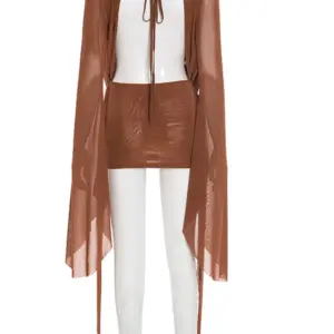 - Gender: Elegant Flare Sleeve V Neck Ruched Sheer Mesh Short Dress