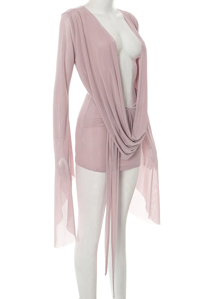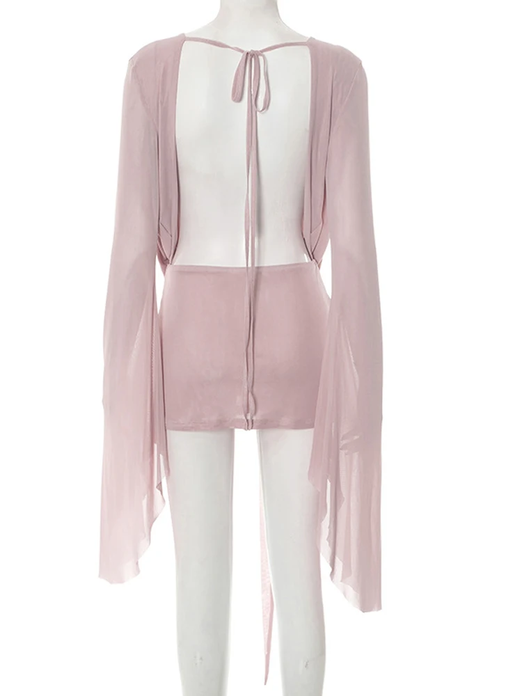 4 reviews for Beyprern Elegant Flare Sleeve V Neck Ruched Sheer Mesh Short Dress Pink Holiday Outfits Beach Cover-Up Dress Night Out Vestidos