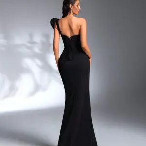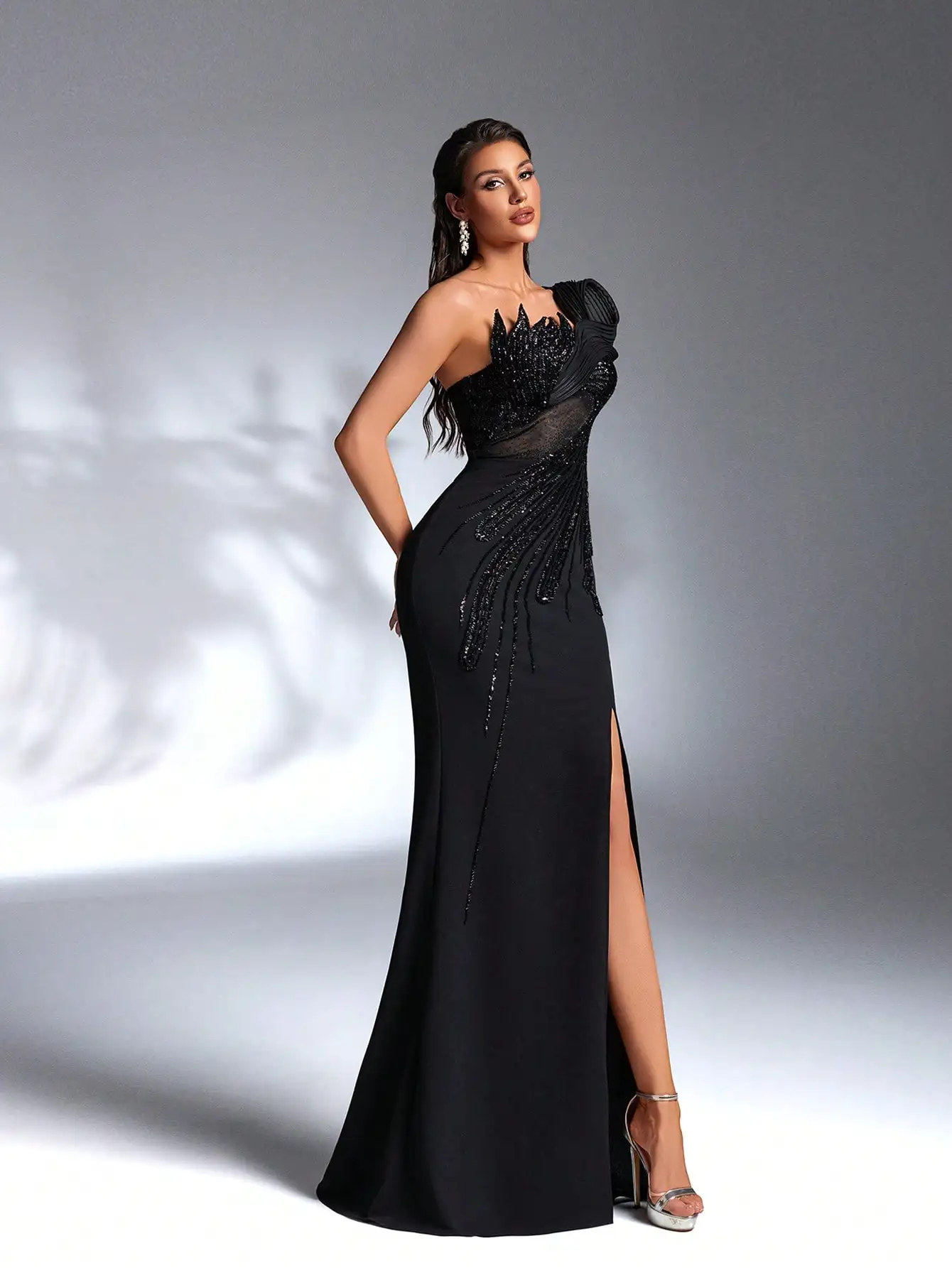 This elegant black evening gown features a one-shoulder silhouette with dramatic pleated detailing and all-over beaded sequin embellishment. The fitted bodice and floor-length skirt create a sophisticated, form-flattering look perfect for formal events, weddings, or upscale parties. Designed for maximum impact, it combines modern structure with timeless glamour.