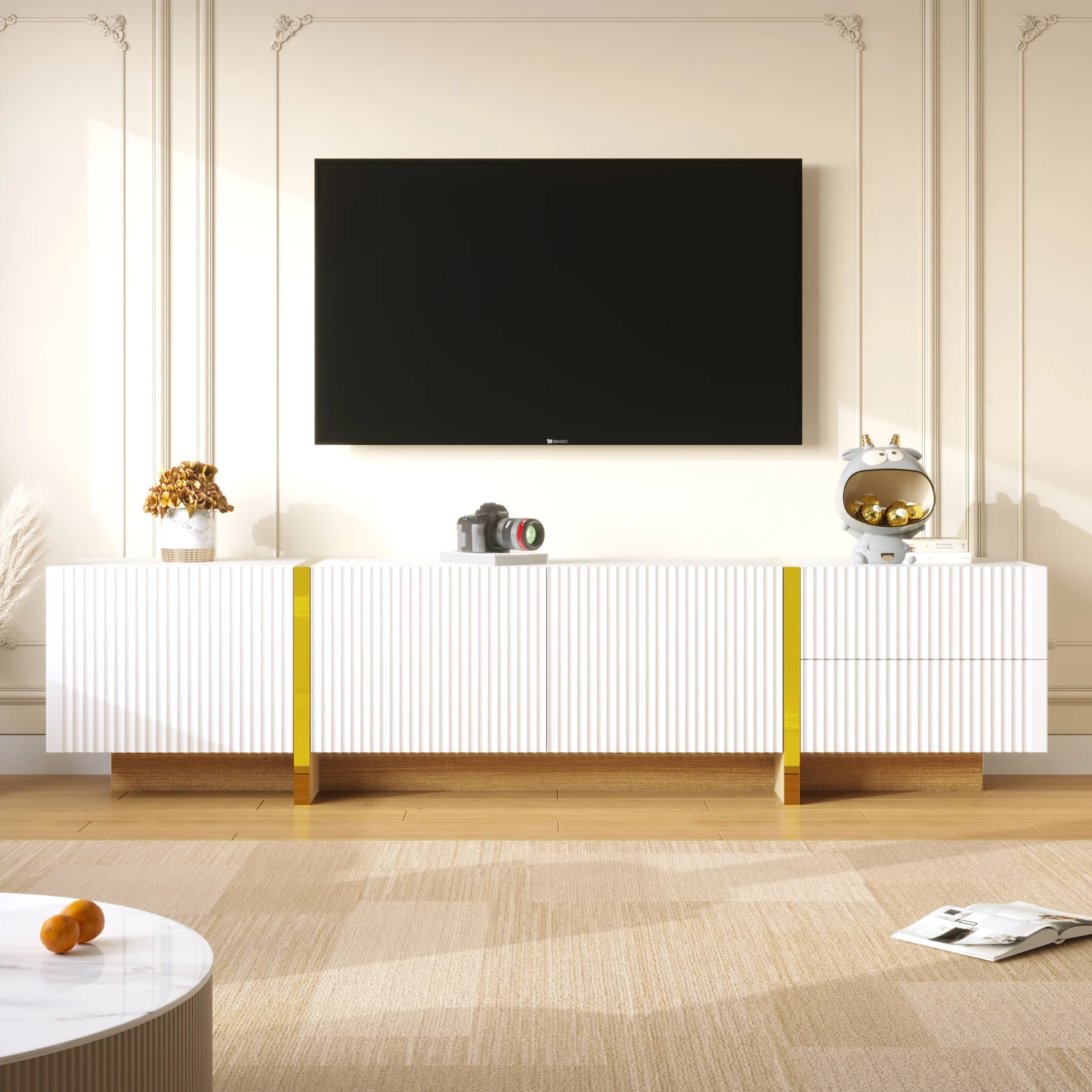 4.Stable and durable: The TV cabinet is made of high-quality MDF and PB and is characterized by its robust construction, which ensures stability and durability.