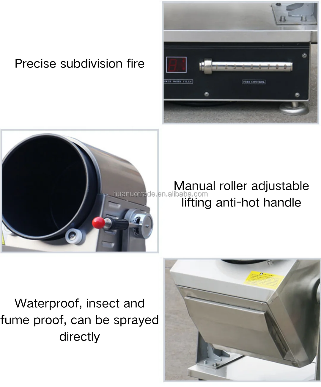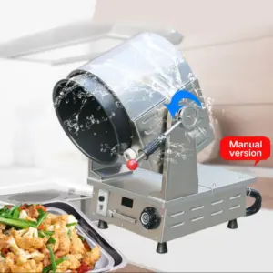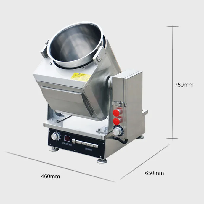 Specification: 300 drum electric dumping 1, stainless steel shell, strong, easy to clean; 2, electromagnetic induction heating, digital tube display, 5 fire control; 3. The wok rotates 360 degrees, the wok body is heated evenly, and the firepower is adjustable; 4, the wok revolution is adjustable, knob switch, clockwise acceleration, counterclockwise deceleration; 5, cast iron pan, general dishes non-stick pan, manual tilt pouring; 6, timing function, up to 60 minutes, time to automatically stop heating; 7, low cost, less investment, can save labor costs, reduce the strength of the cook; 8, small size, no open fire, no smoke and gas, can be placed on the operating table, saving space; 9, simple operation, one person can operate multiple machines, increase the speed of food, save labor costs; 10. Multi-functional use: fried rice, fried noodles, fried vegetables, fried lobster, fried dry goods, fried tea, etc. Application description: Suitable for small fast food restaurant stir-fry Sichuan cuisine, Hunan cuisine. The lab develops dishes, waiting for new ones Installation instructions 1, the power installation needs 220V/50HZ/ two-phase three wire, must be connected to an independent leakage switch and ground; 2. It is recommended to install 32A independent leakage switch and connect the independent GB 2.5 square copper core cable.