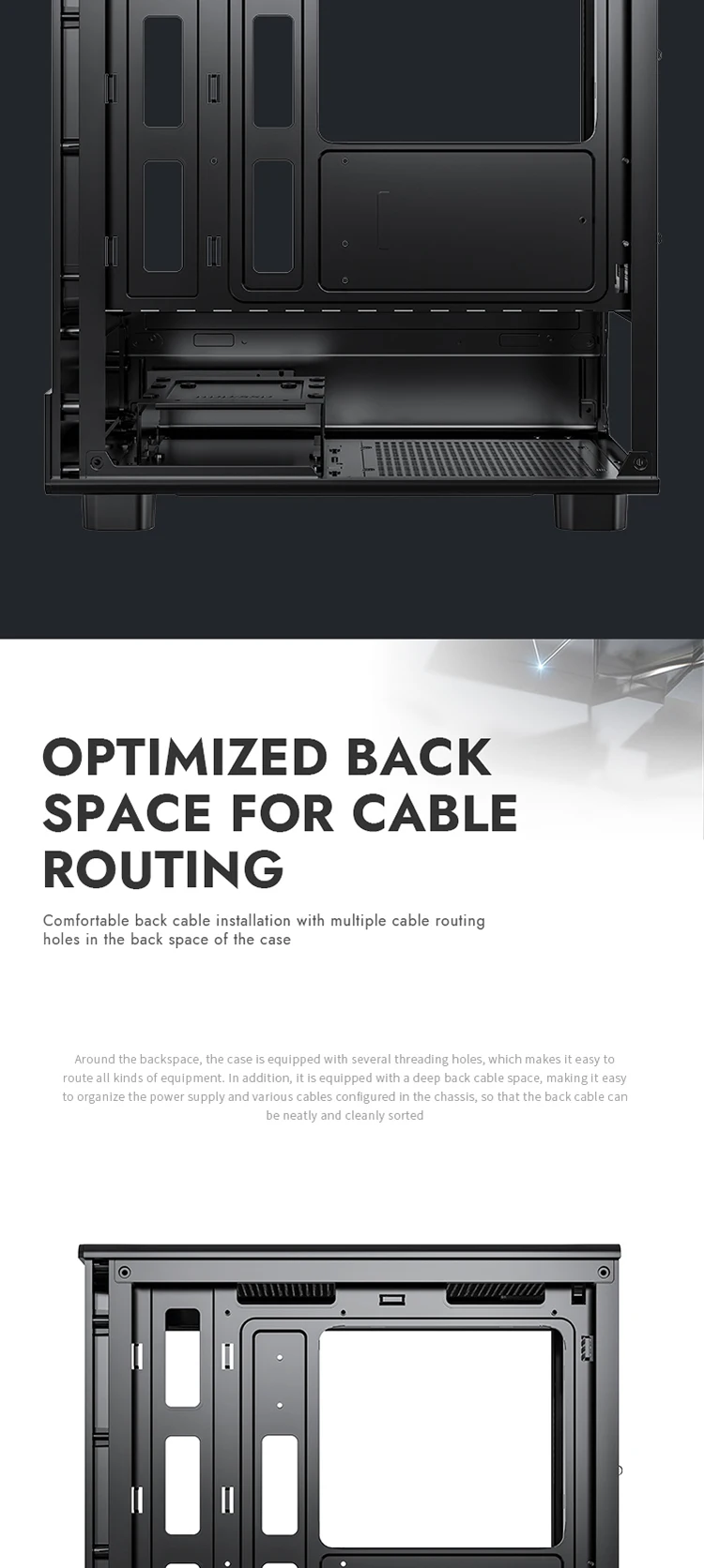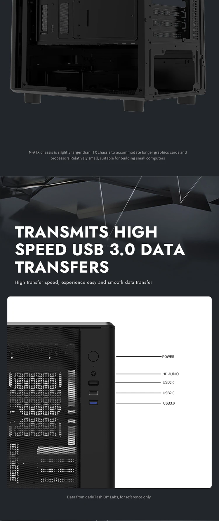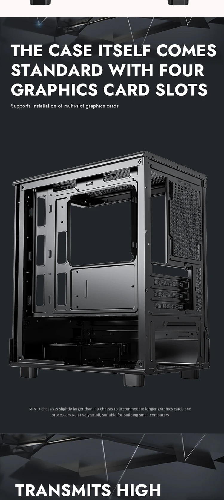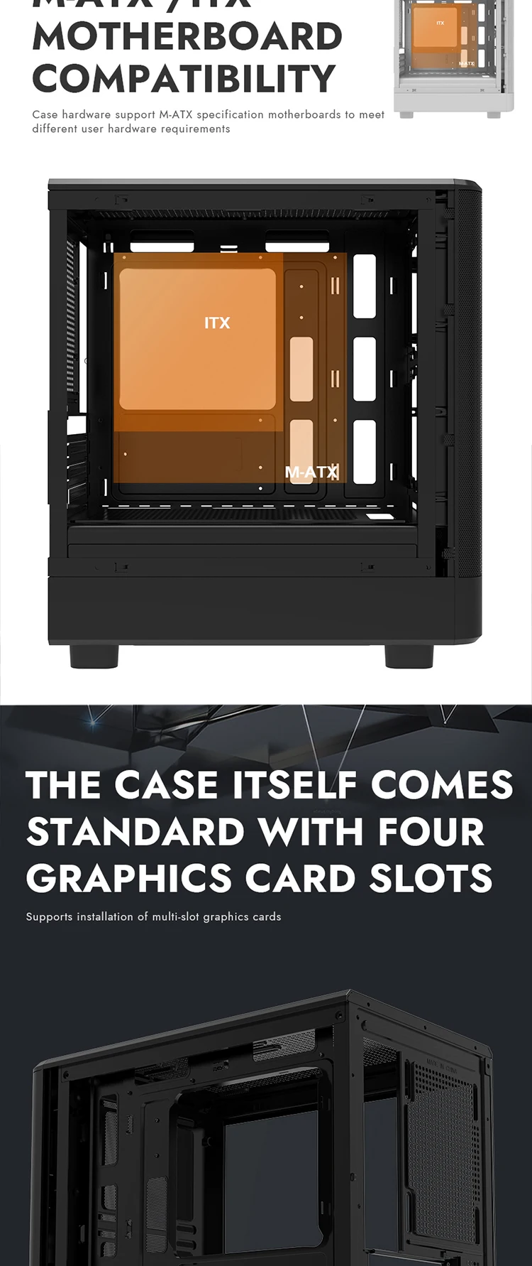 (1) The front panel uses a cool grid design, which effectively improves the air flow circulation in the chassis and increases the heat dissipation effect.
