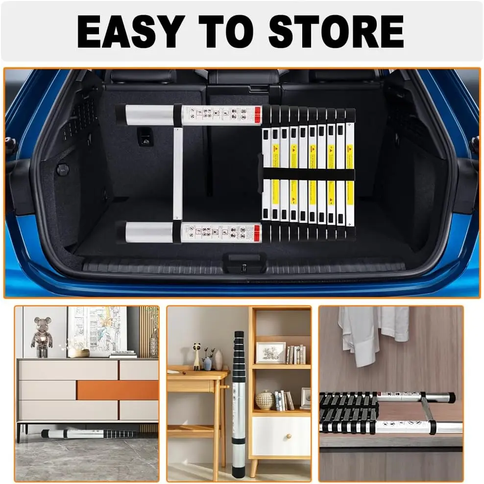 12.5 Foot Telescopic Ladder A-Frame Extension Ladder Height Adjustable with Anti-Slip Feet Stabilizer Bar, Heavy Duty Aluminum Telescopic Ladder 330 LB Load Capacity★Specifications: