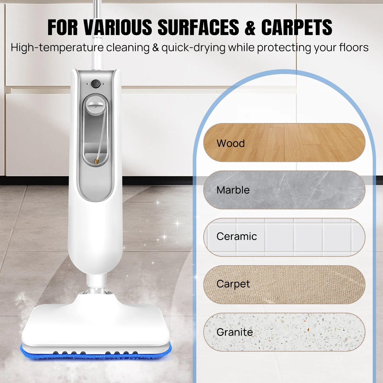 ⭐【Powerful Electric Cleaner】: 100℃ high-temperature steam is generated in just 20 seconds! Our 1500W steam mop provides natural deep cleaning for dust, mucus, and stubborn stains without any chemical residue.