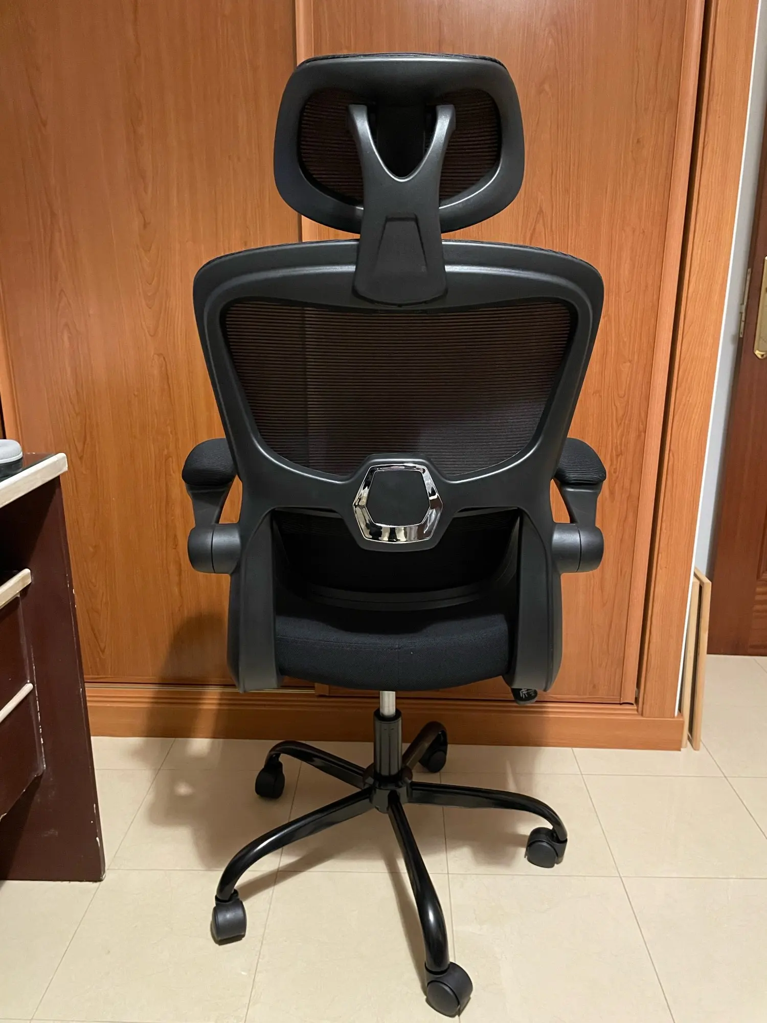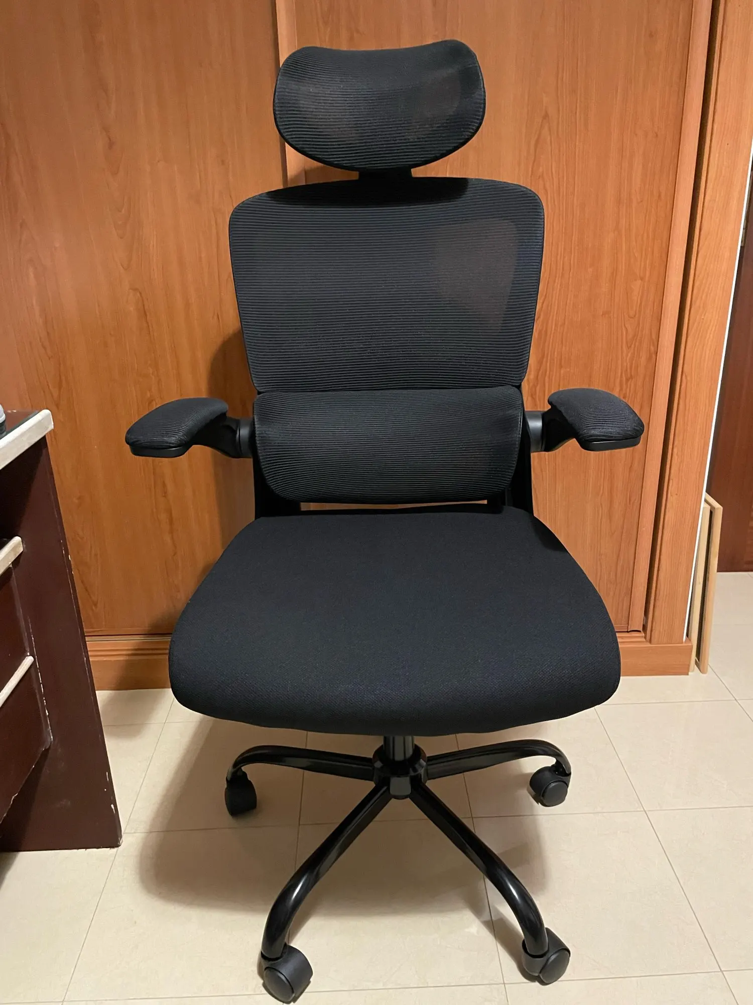 — Flip-up armrests: The arm rests can be turned up and down at will. When you are leading back in the chair to have a rest, the padded arm rests are perfect for backing your elbows. Or when you don’t need to use the chair, you can flip up the arm rests and push the chair under the desk to save space.