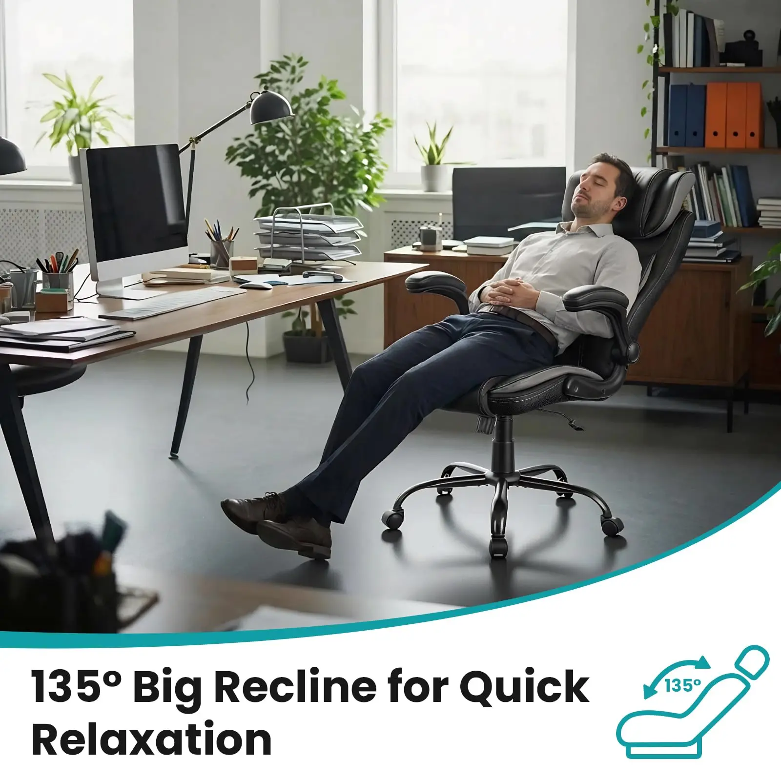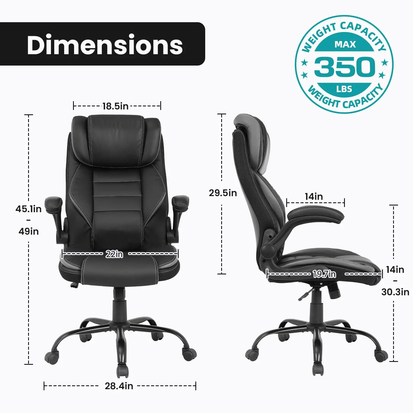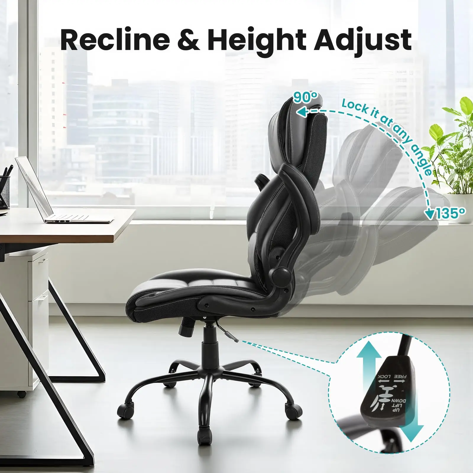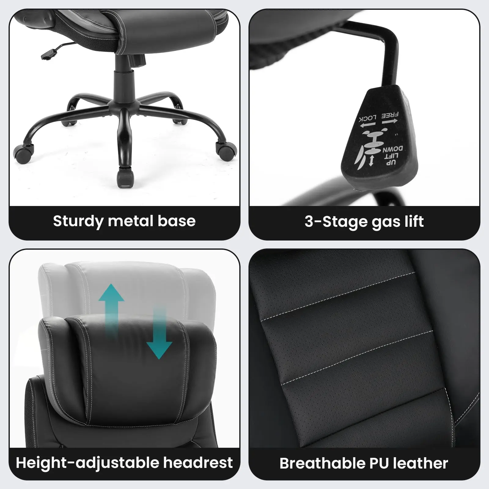Sturdy & Durable Executive Chair: This big and tall office chair combines durability and comfort, featuring scratch-resistant faux leather that won’t peel or crack, complemented by a perforated PU seat that cools and comforts. With a sophisticated design that fits any workspace, the home office chair offers a smooth 360° swivel and a 3-stage gas lift tested to hold up to 350 lbs for assured safety and durability, making it perfect for any professional office or home