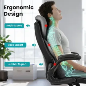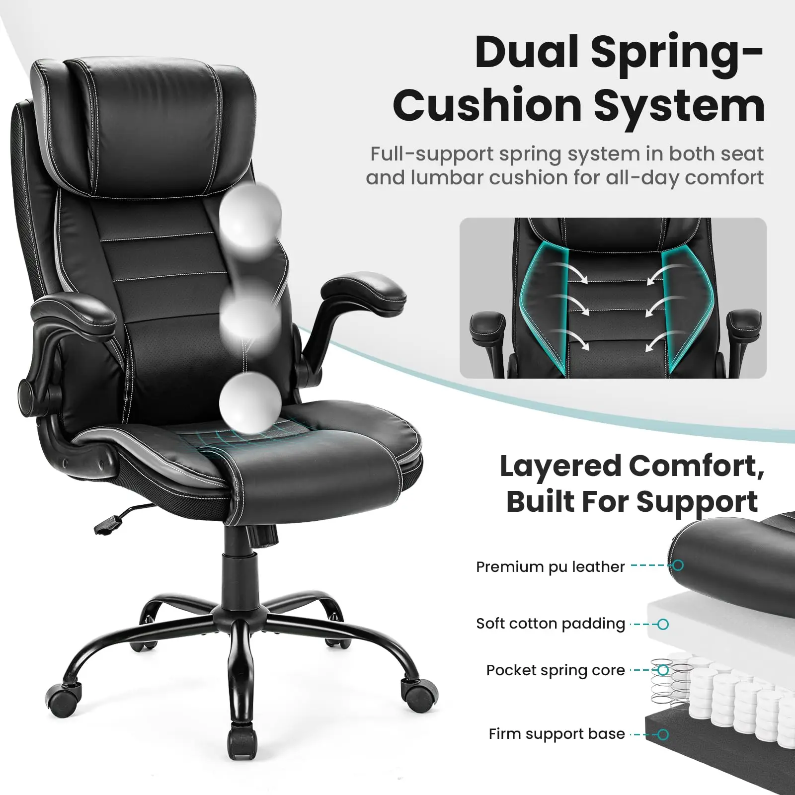 Unlock Comfort with Dual Spring Systerm: Experience all-day comfort with our ergonomic office desk chair. The seat and lumbar cushion are equipped with a dual support spring system, layered with high-density foam to provide targeted support. This design cradles your body’s natural curves, effectively reducing fatigue and discomfort in the shoulders, neck, and back. Designed to eliminate sedentary back pain, this high back office chair helps you to stay productive and pain-free through sitting long hours