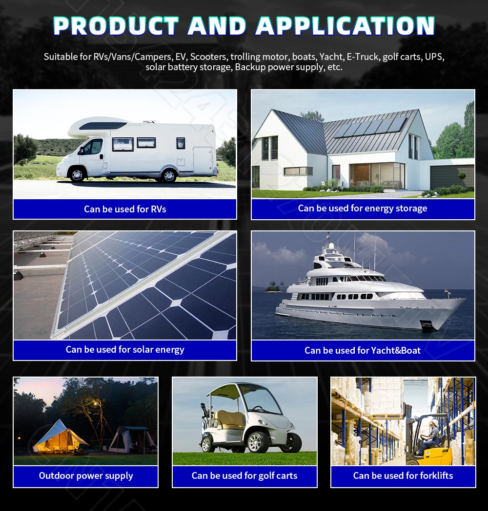 Applicantion:RV Vans Campers EV Boats Yacht Golf Carts Forklift Solar Battery