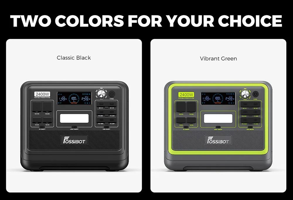 F2400 solar power station, with 300W, 500W, 700W, 900W and 1100W input power protection power supply, the charging speed is completely controlled freely, the adjustment knob can keep the input voltage constant, greatly extend the service life of FOSSiBOT F2400, protect your equipment.