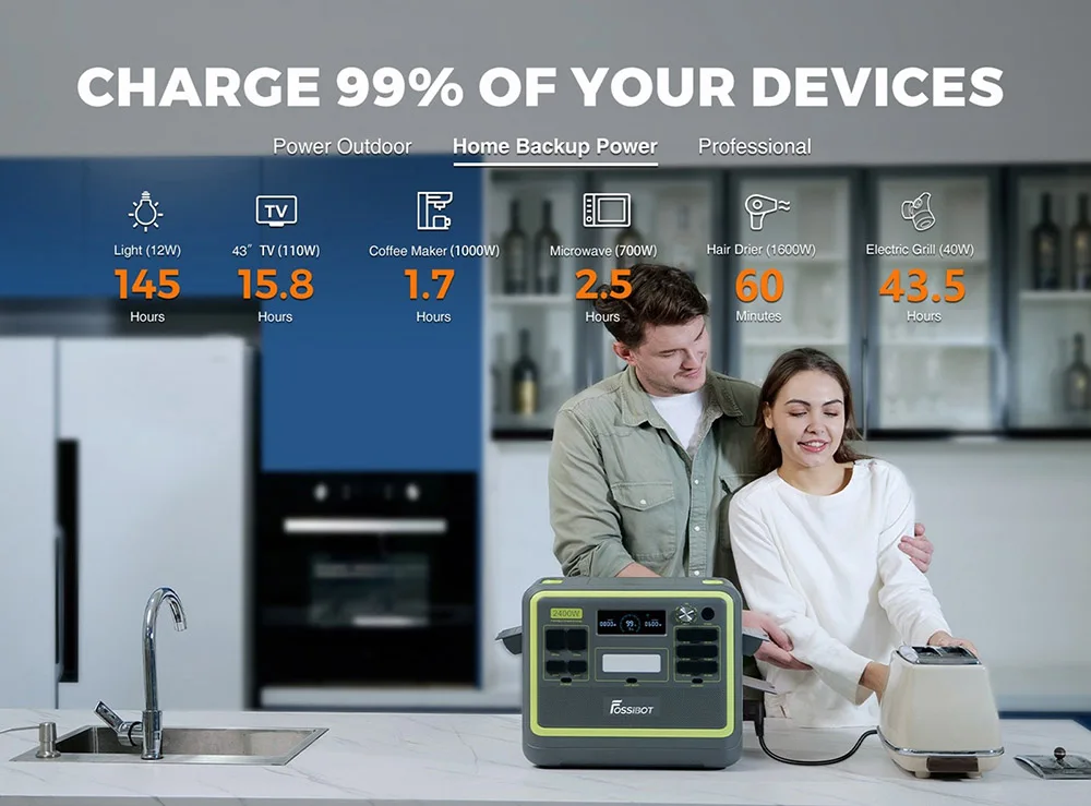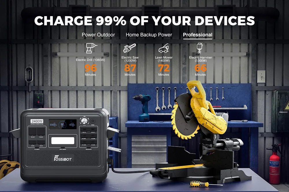 FOSSiBOT portable power station adopts the latest bidirectional inverter technology and the perfect combination of intelligent input power adjustment knobs. The input power reaches 1100W and can realize 0-80% charge in 80 minutes, fully charged in 1.78 hours.