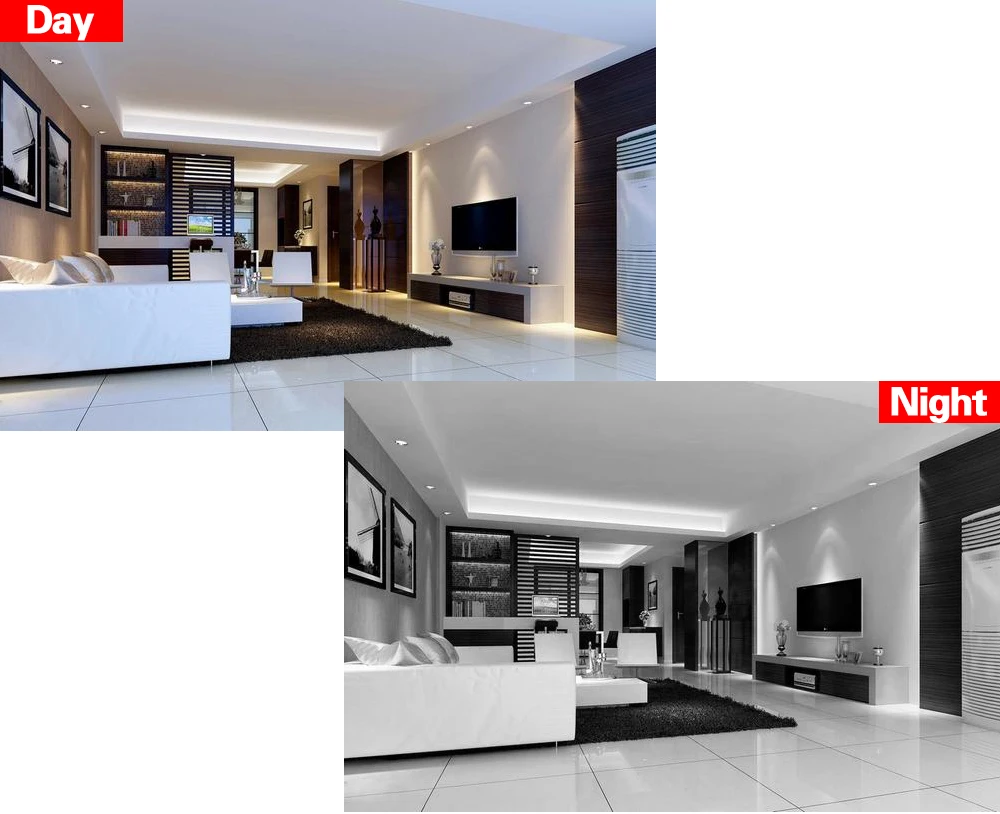 The smart IR-Cut filter switches automatically between day and night to reduce color cast in day time and enhance image brightness at night making sure you can get vivid surveillance footage from dawn to dark.