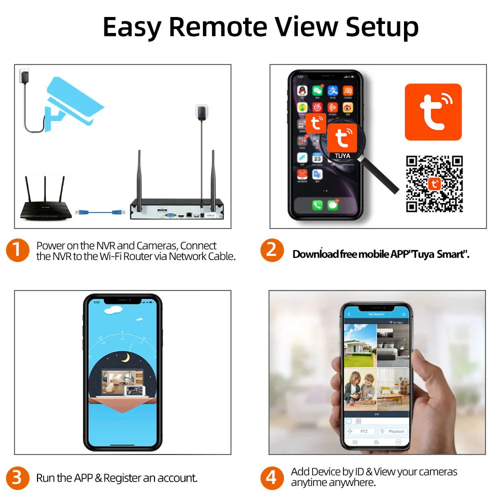 Easy setting , just 4 steps for mobile phone viewing,View live video of the system from anywhere and anytime via you smart phone, table or PC with advanced P2P technology, you are able to remote access your system in minutes or less, no portforwarding needed, remote access has never been so easy!!!