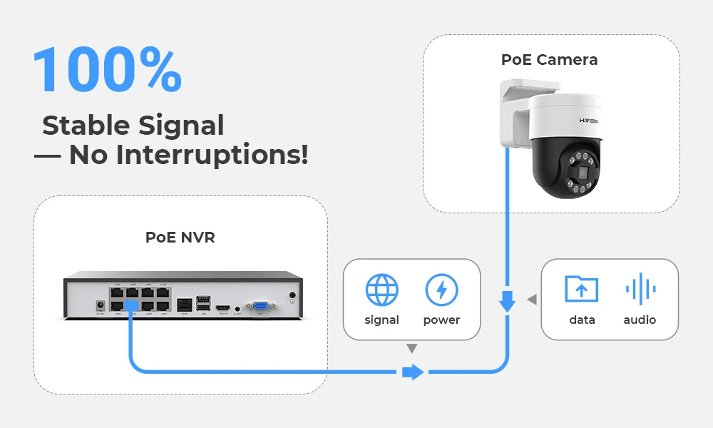 With a Plug-and-Play reliable connection, this PoE camera uses a single Ethernet cable to transmit both data and power. Built-in microphone and speaker for real-time voice intercom.