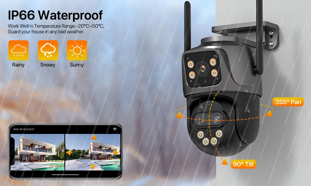 3-lens, 2-screen, Notifications alarm, humanoid tracking, two way voice intercom 360 monitoring, full color night vision, IP66 waterproof, mobile phone remote monitoring,Share video, SD card storage, 24 hours video recording