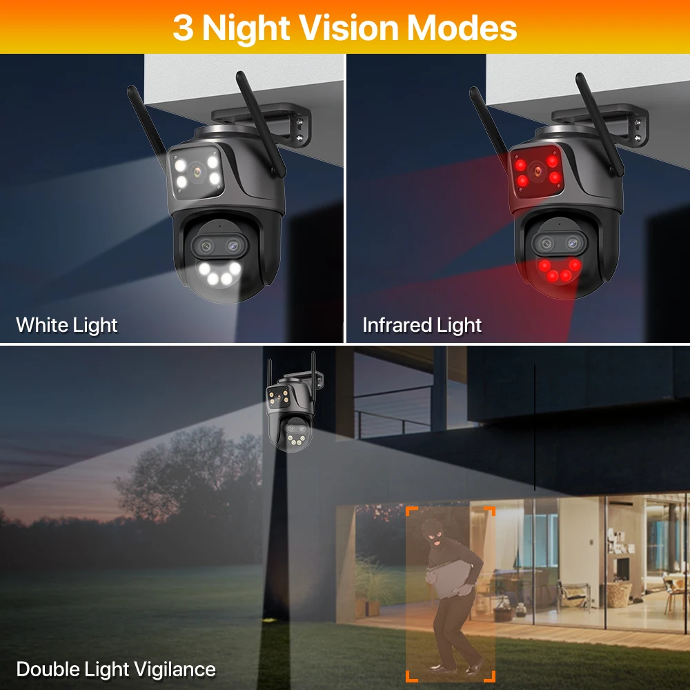 – Dual light source design, built-in infrared light + white light, night vision infrared and night vision full color can be set;