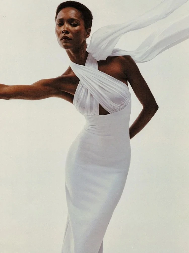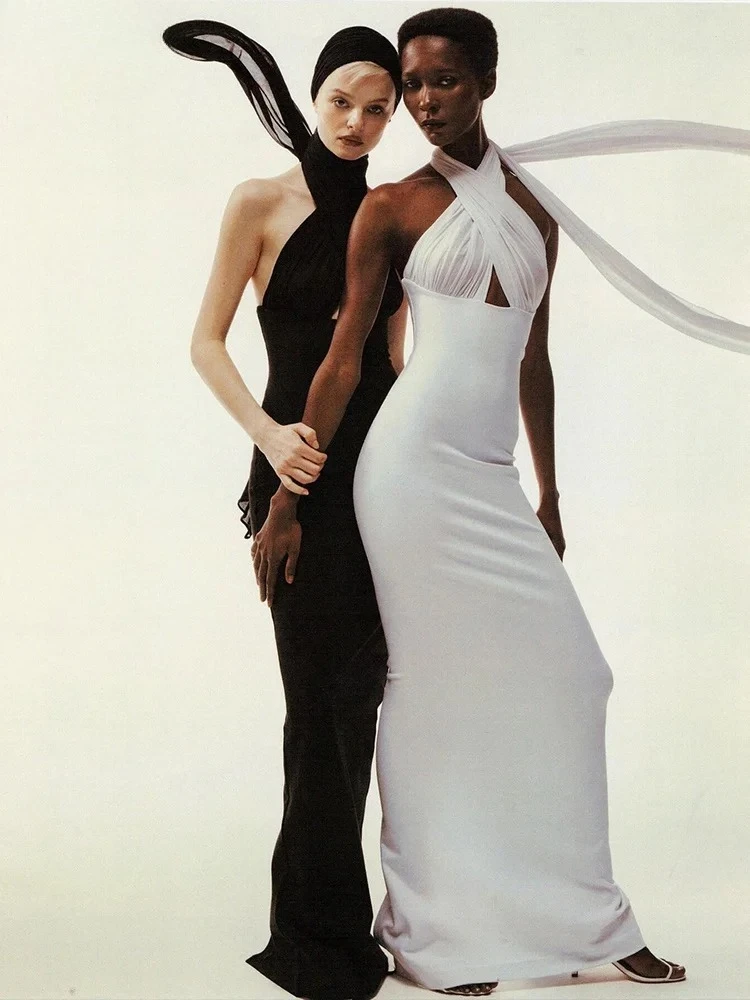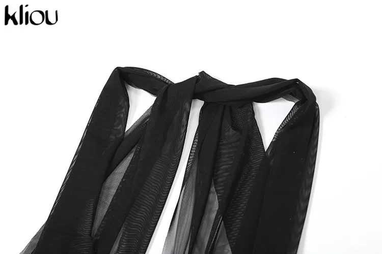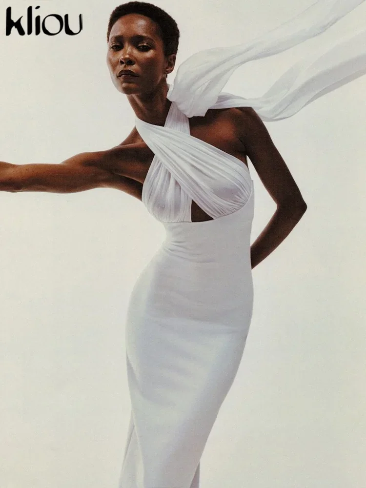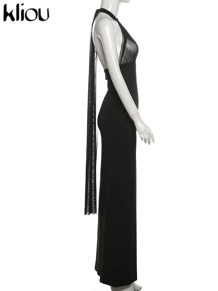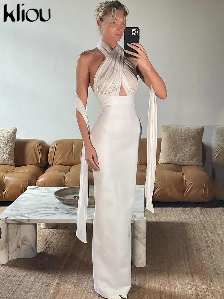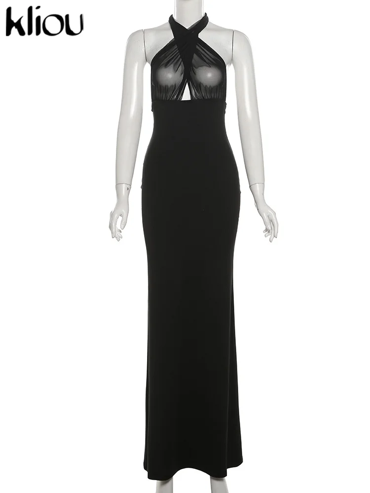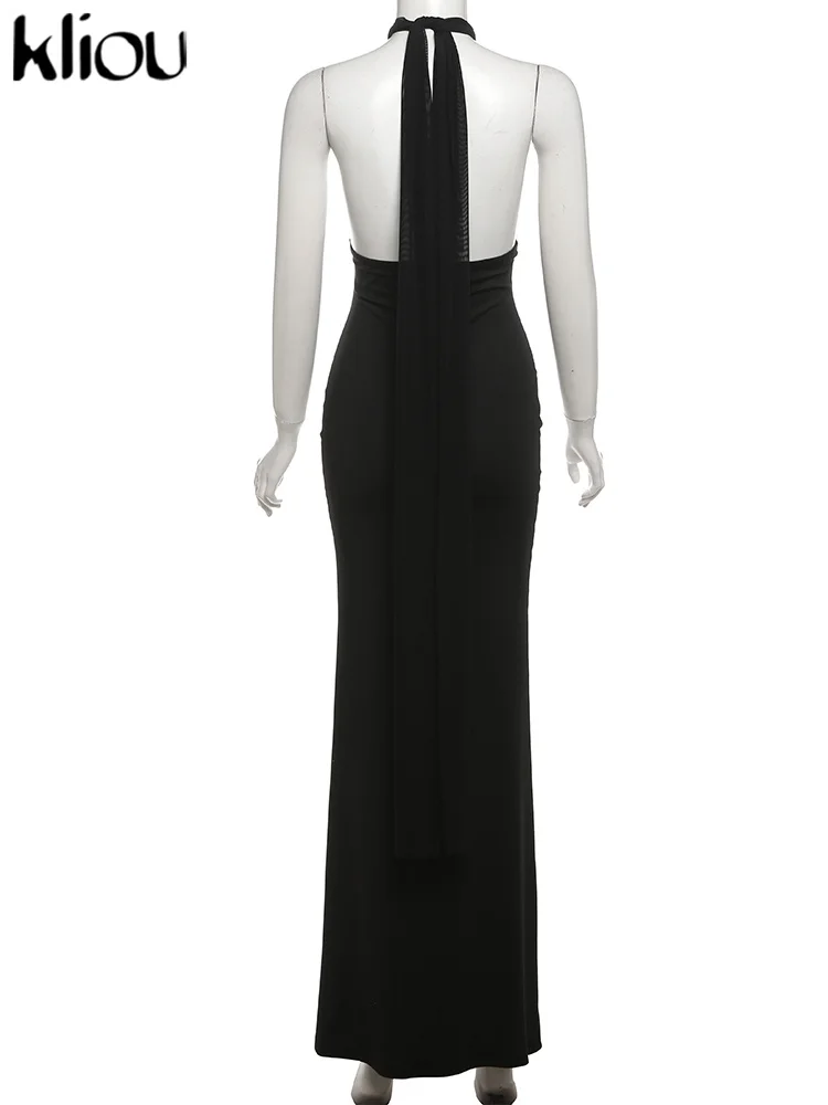 kliou Ribbons Women Long Dress Patchwork Cross Halter Sleeveless Backless Straight Vestidos Female Elegant Evening Classic Robe
