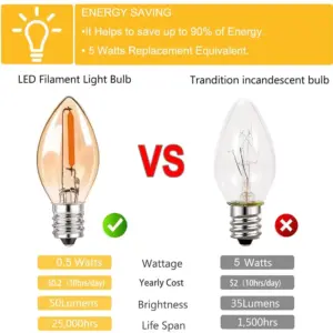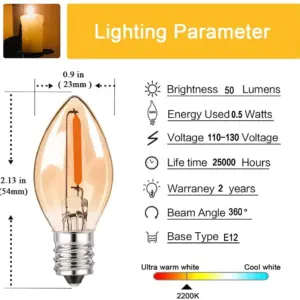 LED Night Light Bulbs C7 Chandelier E12 E14 Base Decorative Light Bulbs 0.5 Watts Christmas Candle Bulb 2200K Amber Glass 25pcs