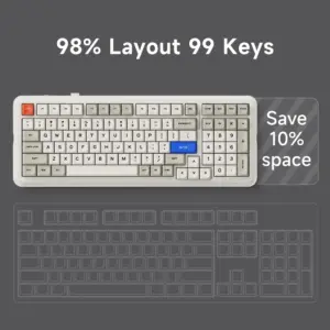 The K99 V2 offers ergonomic design for long-term comfort, a compact 98% layout for space-saving efficiency, and dual-driver support for full customization with key remapping and dynamic lighting modes.