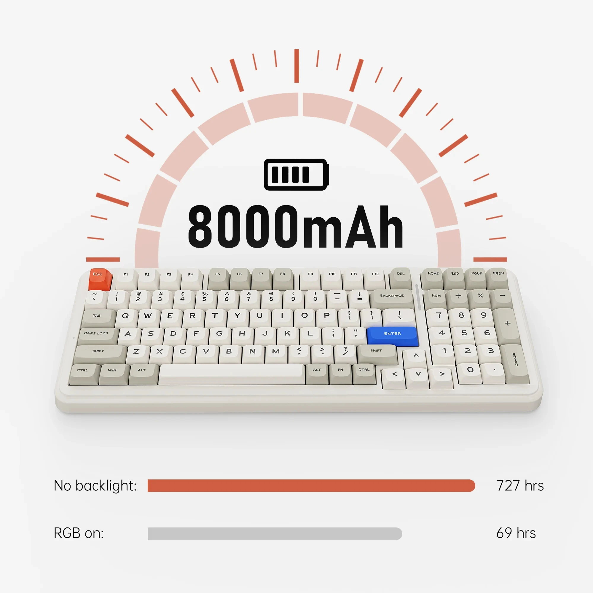 With a massive 8000mAh battery, the K99 V2 keeps you going through every grind and game. Enjoy up to 69 hours with RGB lighting on, or extend your uptime to an incredible 727 hours with lighting off. Whether you’re deep into a marathon gaming session or powering through a long workweek.