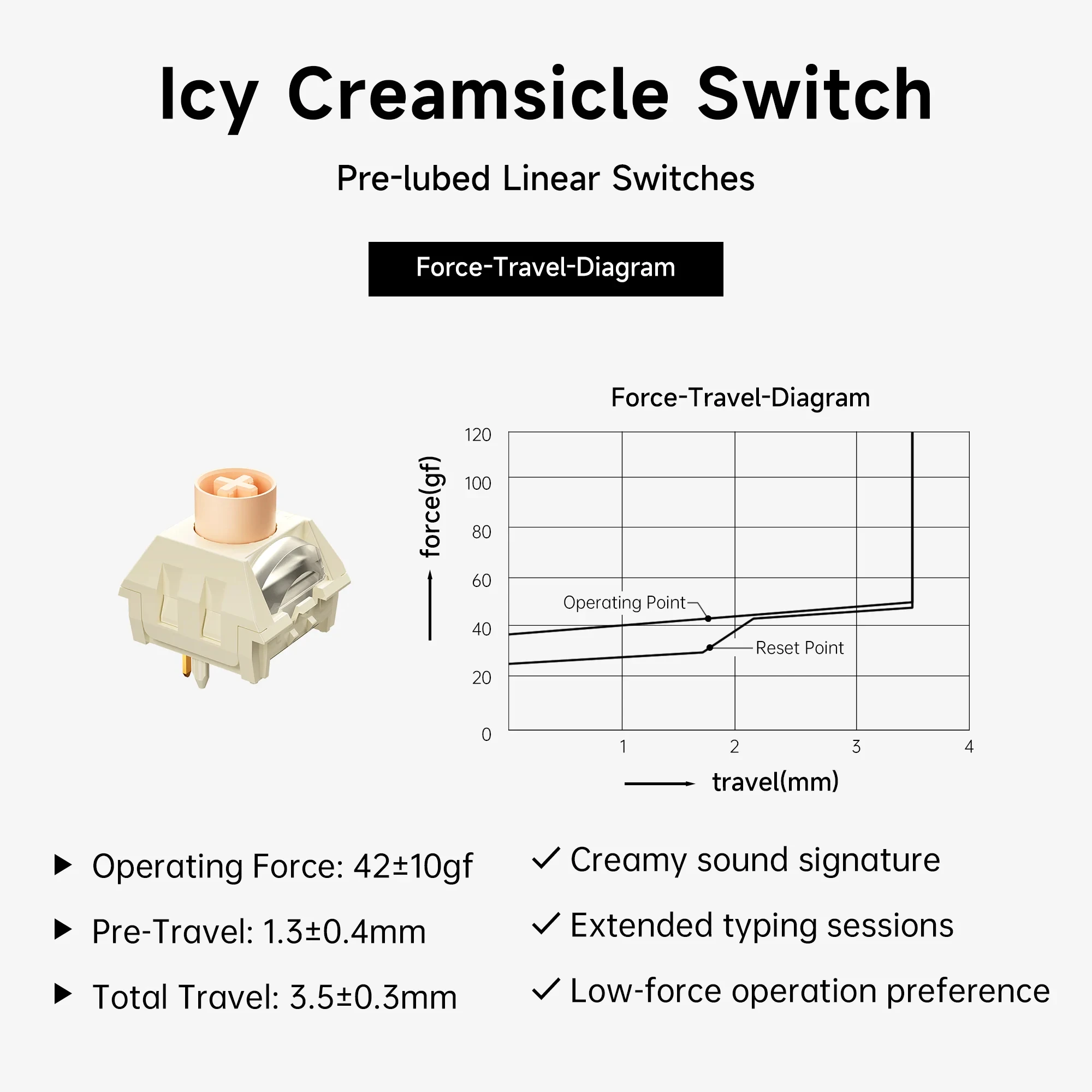 Experience effortless keystrokes with a soft, silky-smooth feel and a satisfyingly gentle thock. Designed for both comfort and performance, this switch features a BOX structure with a light diffuser, gold-plated spring, and pre-press mechanism for ultra-smooth actuation. It’s dustproof, waterproof, and built to last—perfect for long typing sessions or anyone who prefers low-force.