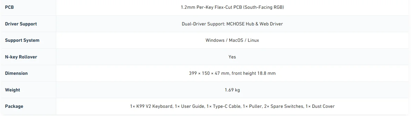 Featuring a compact 98% layout with 99 keys, the MCHOSE K99 V2 combines a refined gasket-mounted structure with six layers of sound-dampening padding for crisp keystrokes. With tri-mode connectivity and dynamic RGB lighting, it delivers a seamless typing experience that inspires creativity. Built for gamers, typists, and creators who demand speed, comfort, and customization.