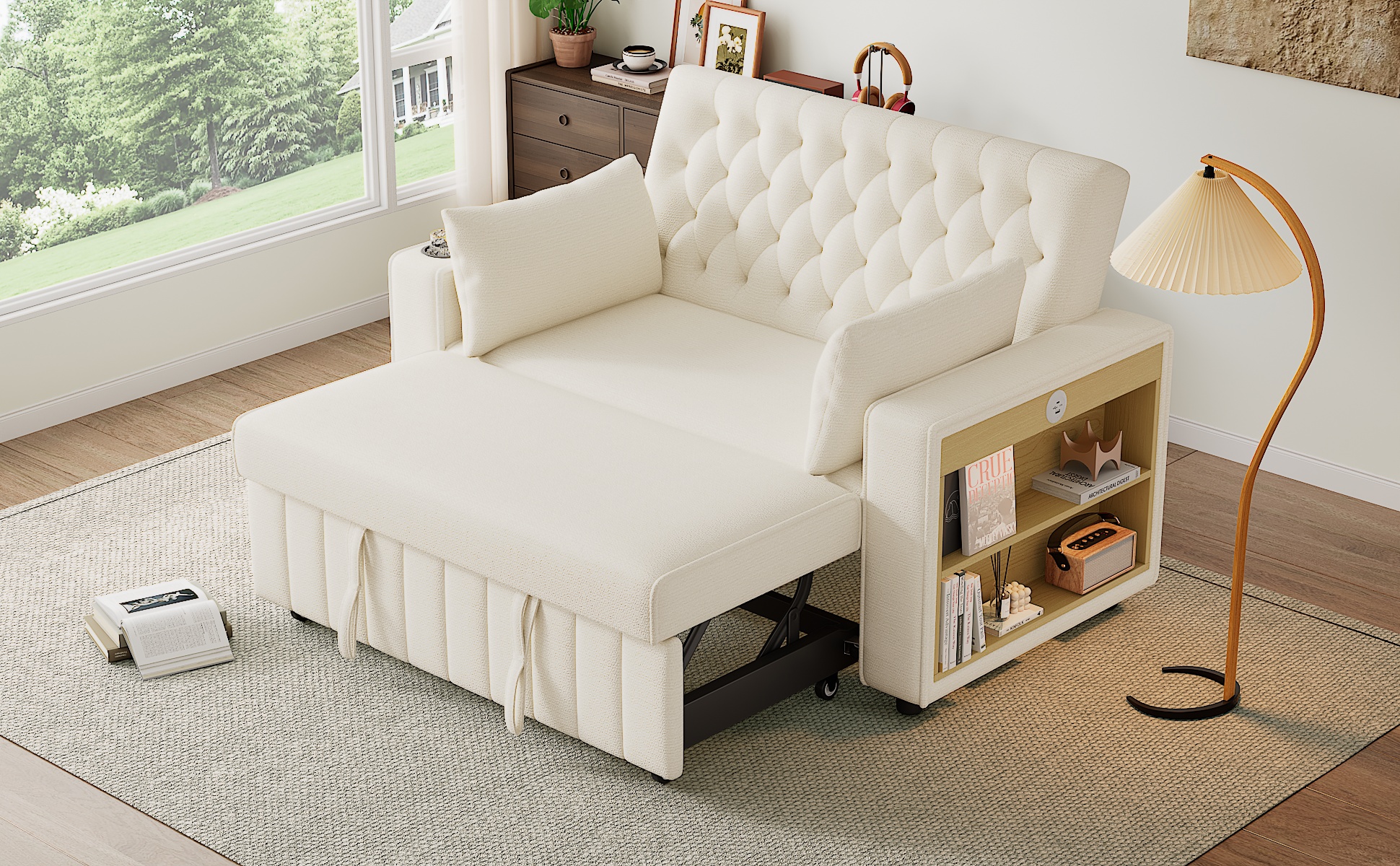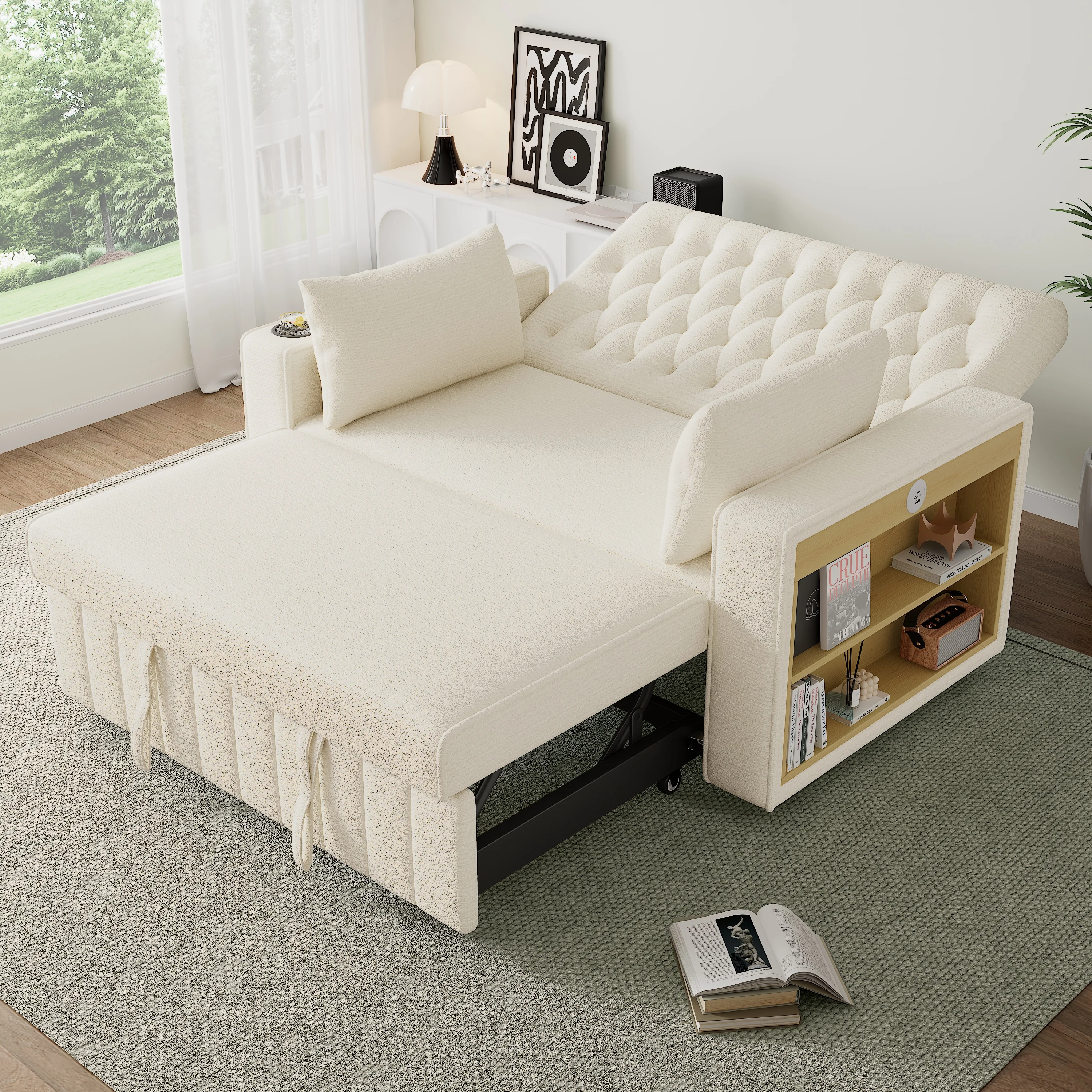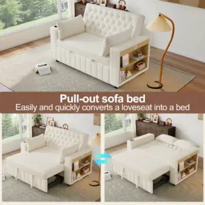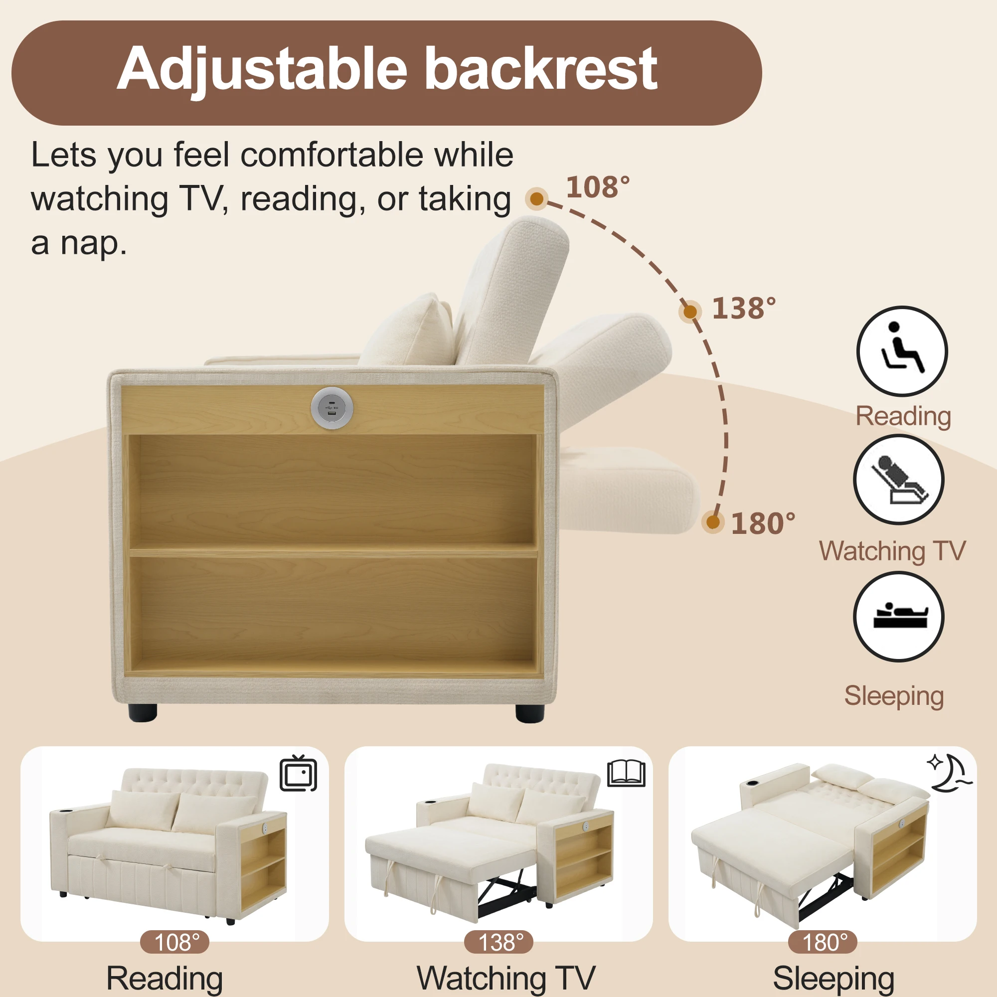 Multi Functional Sofa Bed, Modern Folding Sofa With Storage And Sleep Functions, USB Charging Port And Pillow, Beige Color